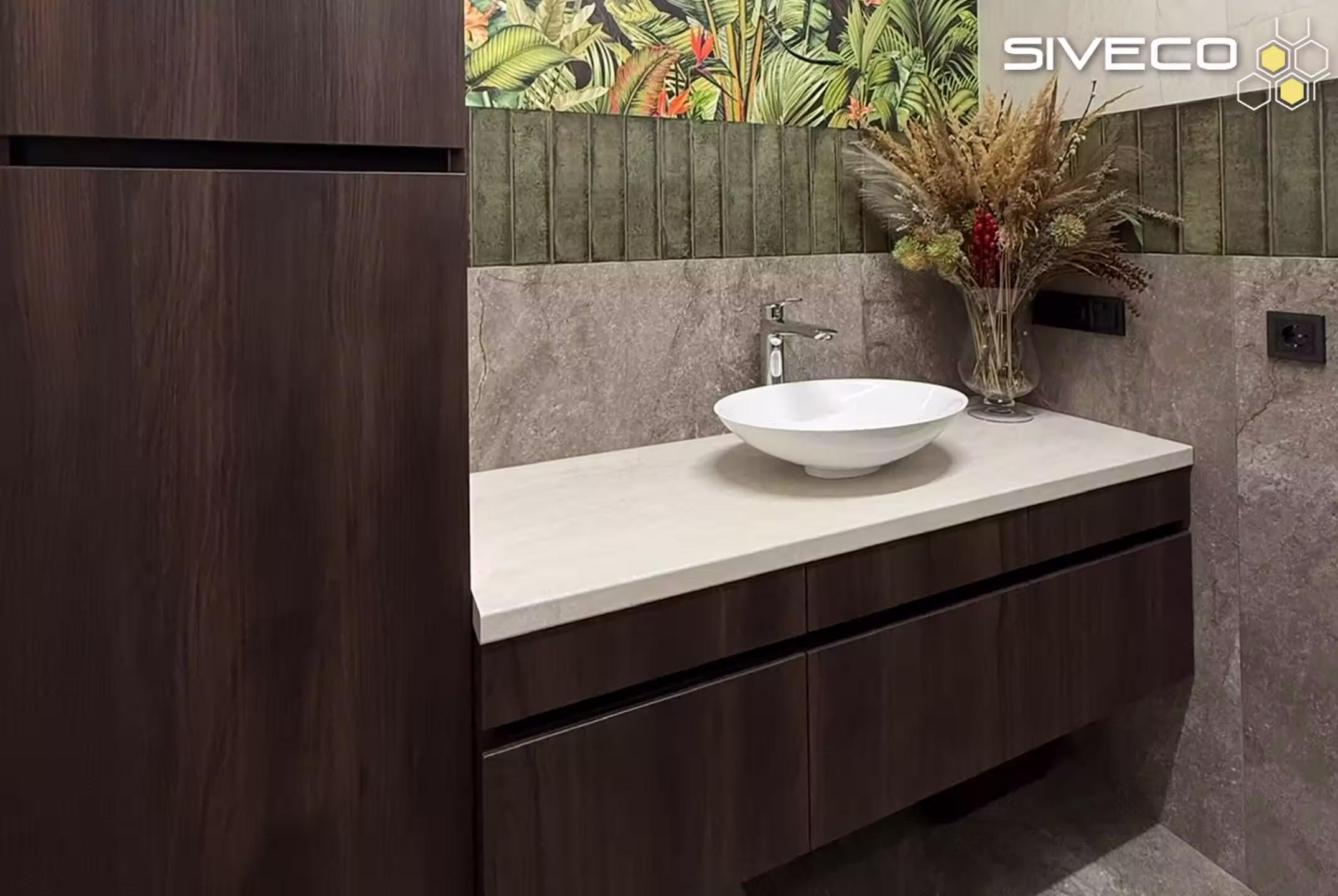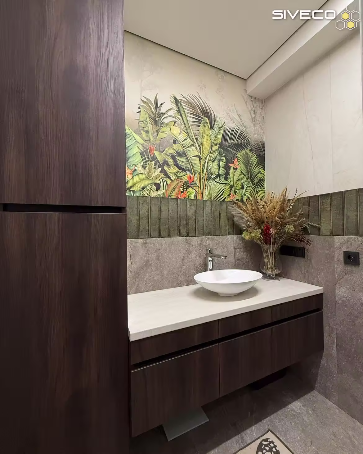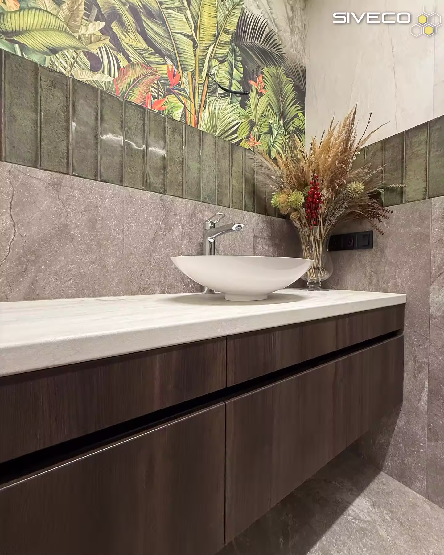 Головна декоративна деталь — це яскраве панно з тропічним малюнком над умивальником. Воно відразу привертає увагу, додає інтер’єру характеру та розбавляє строгість оздоблення під камінь.