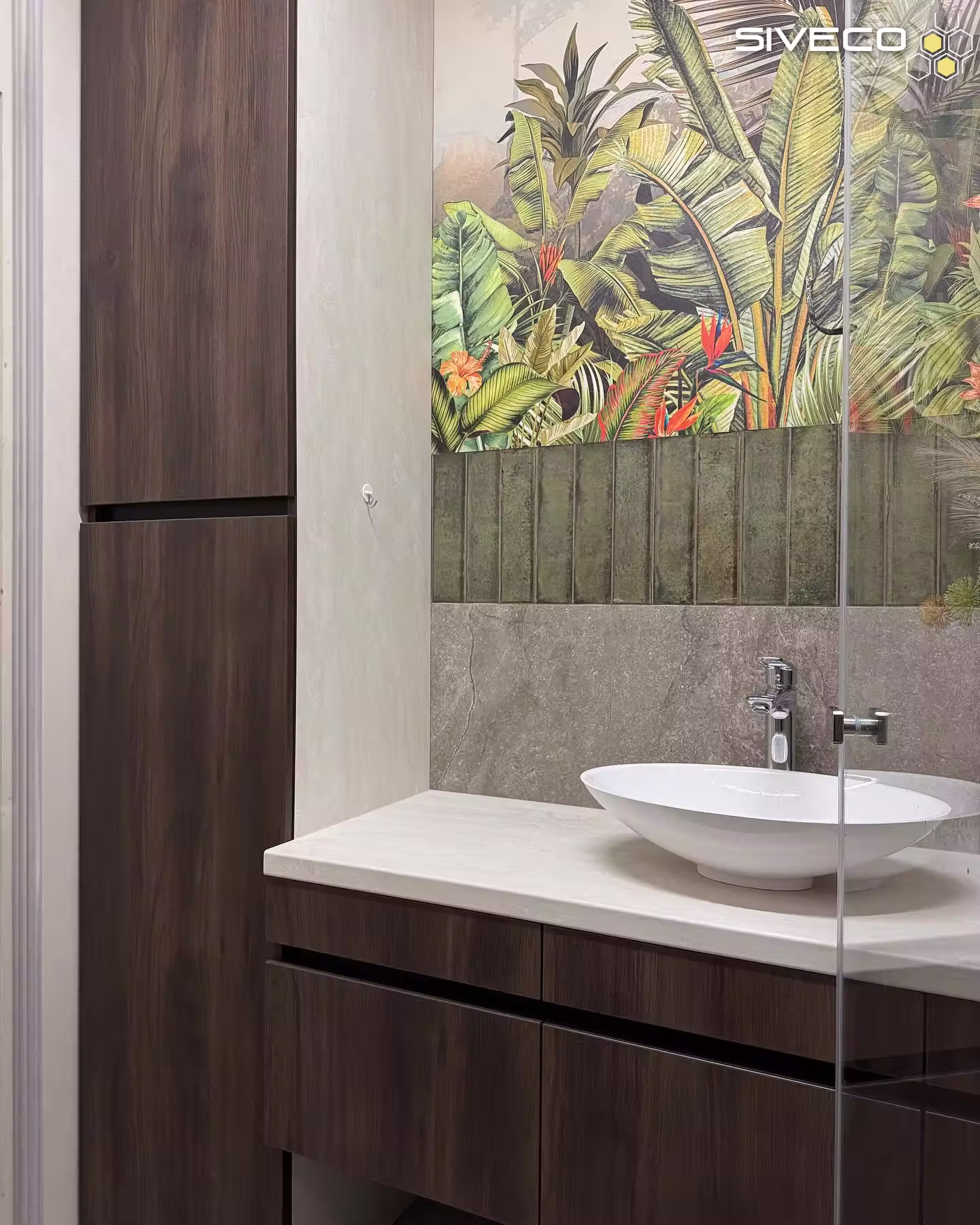 Оригінальним акцентом є смуга вертикальної глянцевої плитки насиченого зеленого кольору. Вона візуально розділяє зони та ідеально гармонує з кольорами тропічного малюнка на стіні.