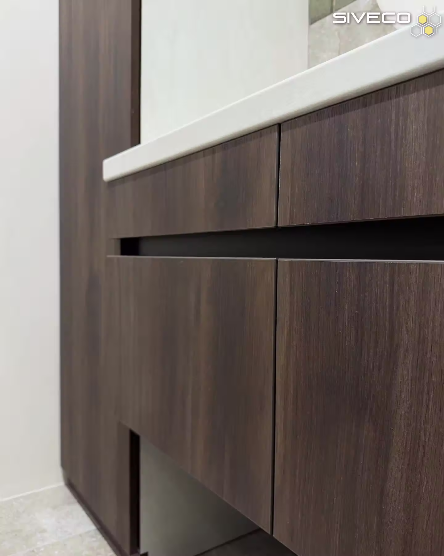 Система відкривання фасадів реалізована за допомогою інтегрованої ручки-профілю, що підкреслює мінімалістичний дизайн і дозволяє зберегти гладкість фасадної поверхні.