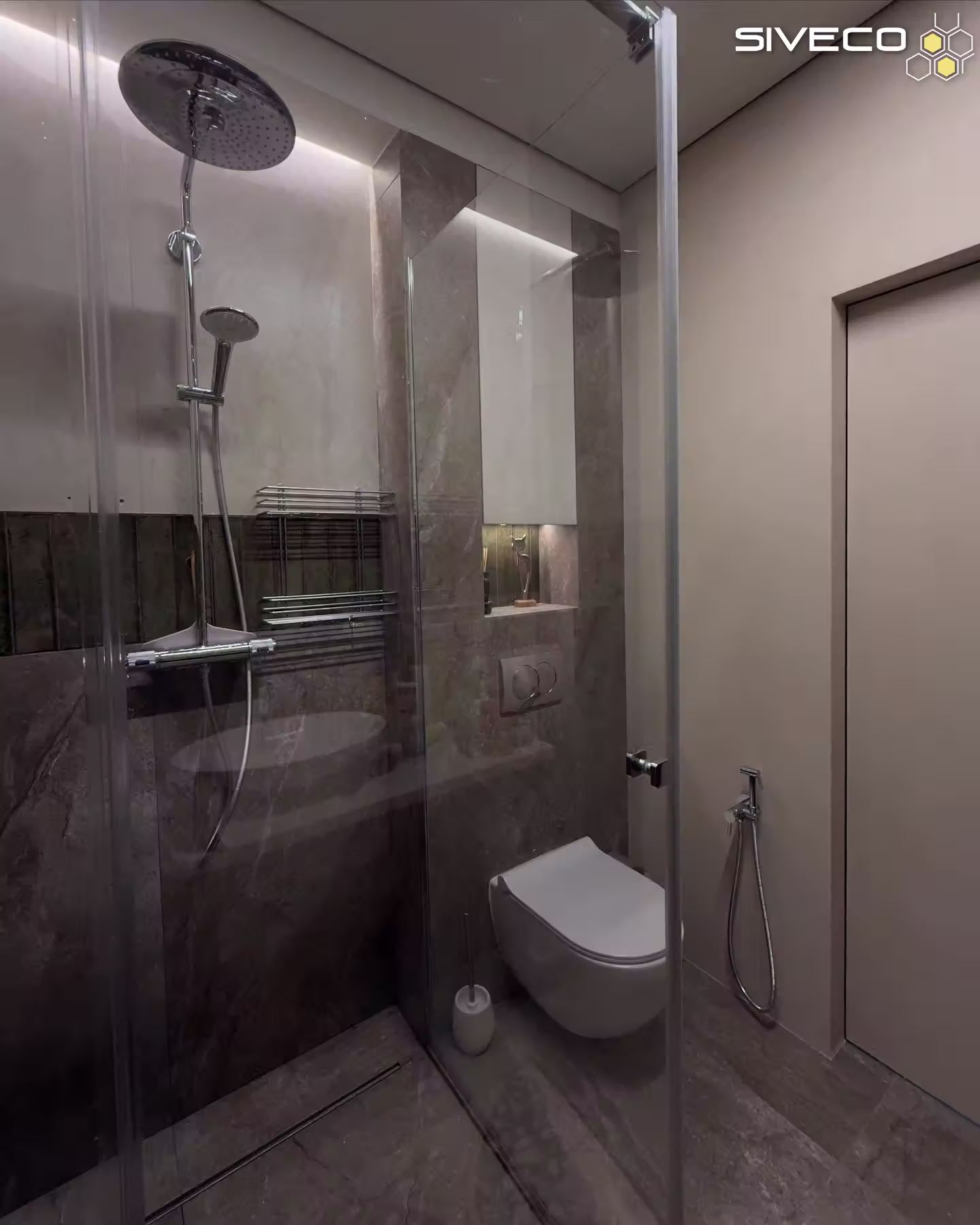 Оформлення цієї ванної кімнати — вдале поєднання стилю, функціональності та довговічності.