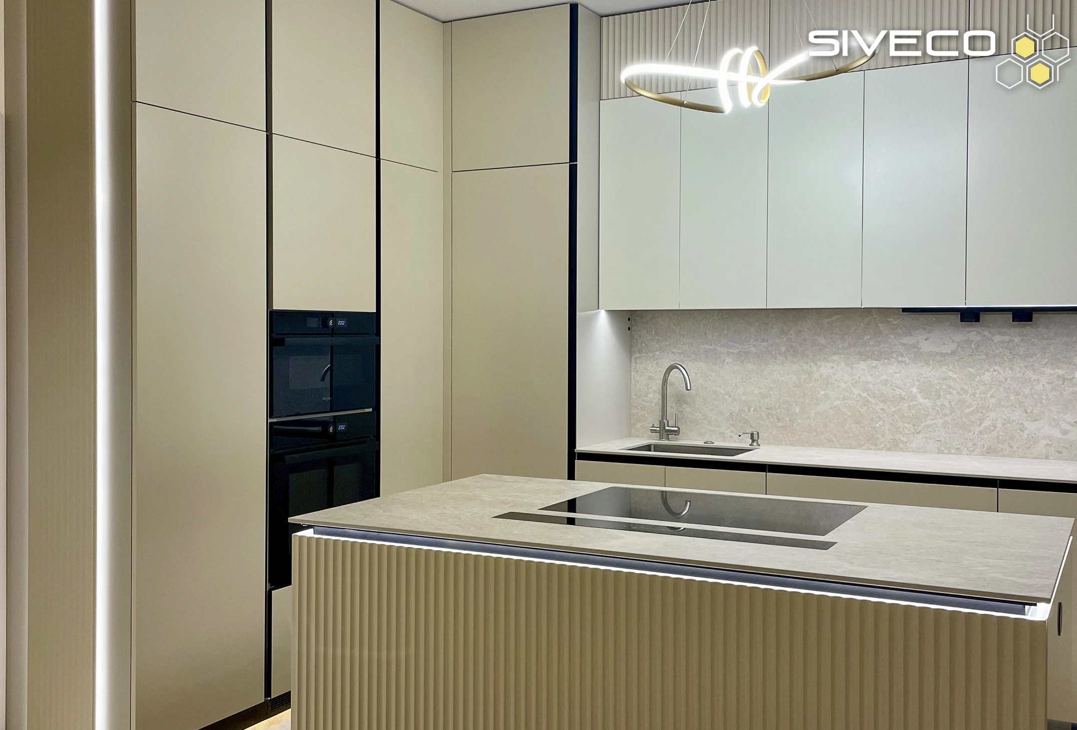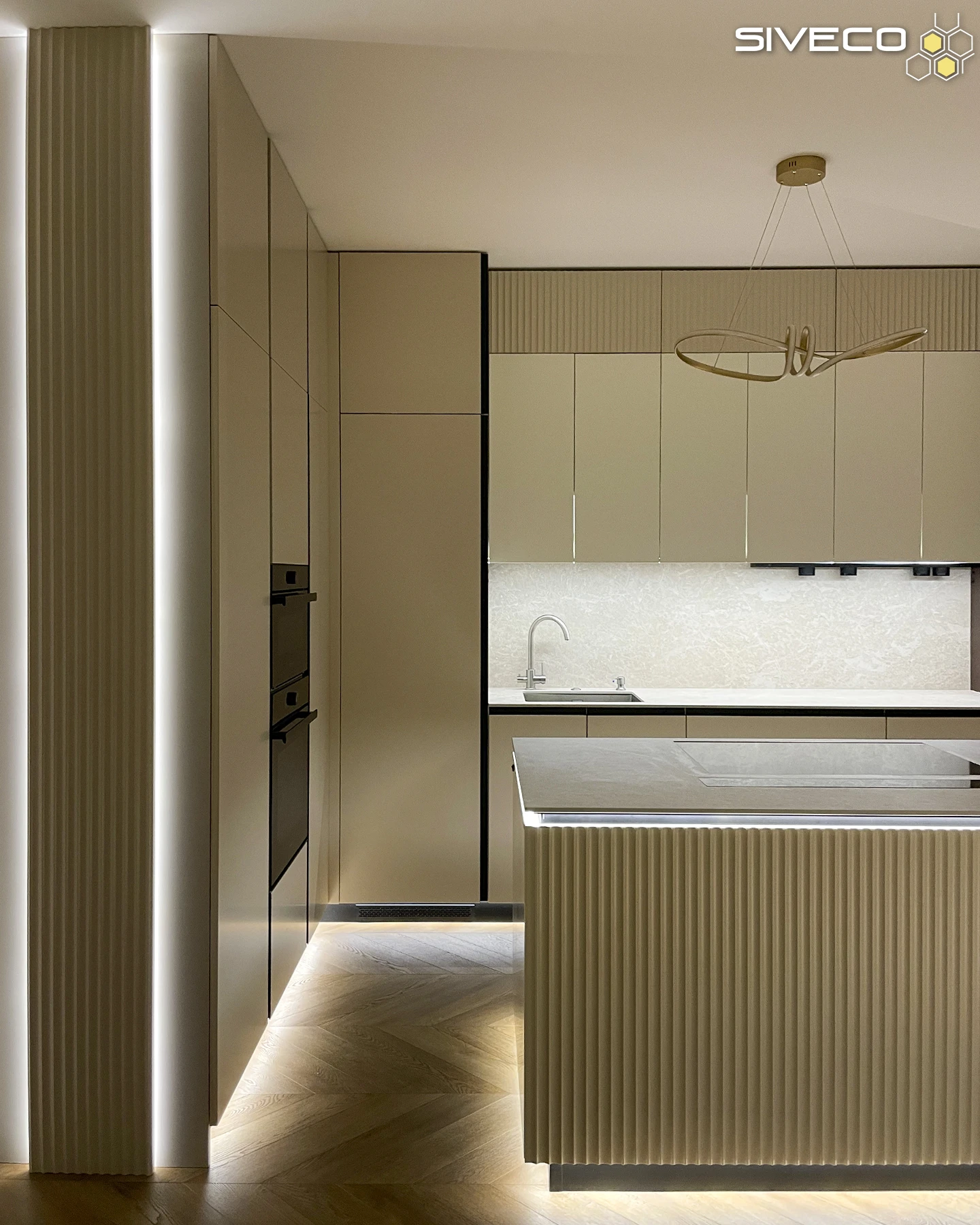 Рифлена 3D-панель на острові — головний візуальний якір проекту. Завдяки грі тіней на рельєфі, масивна конструкція втрачає вагу, перетворюючись на стильний арт-об'єкт, що змінюється залежно від кута огляду.