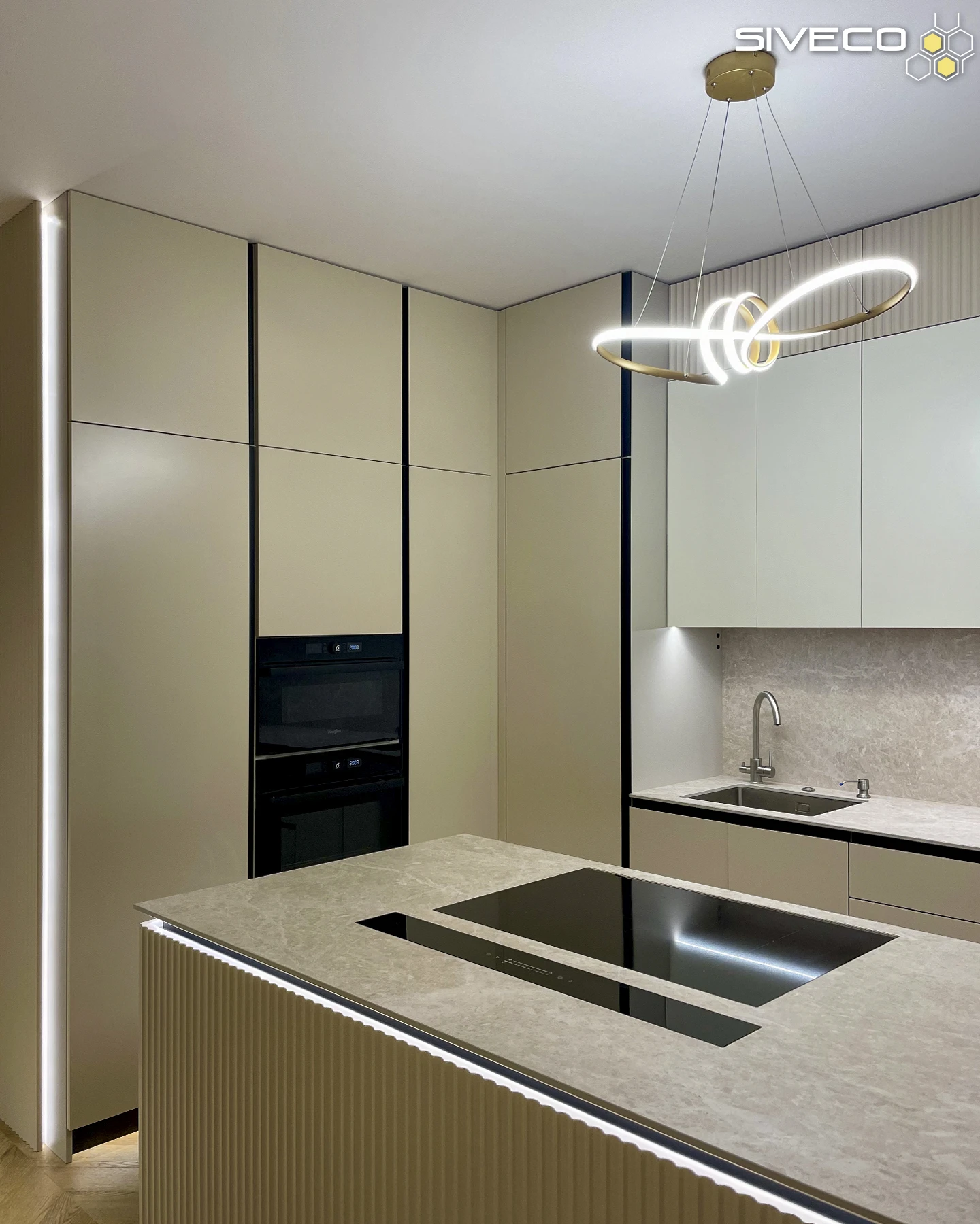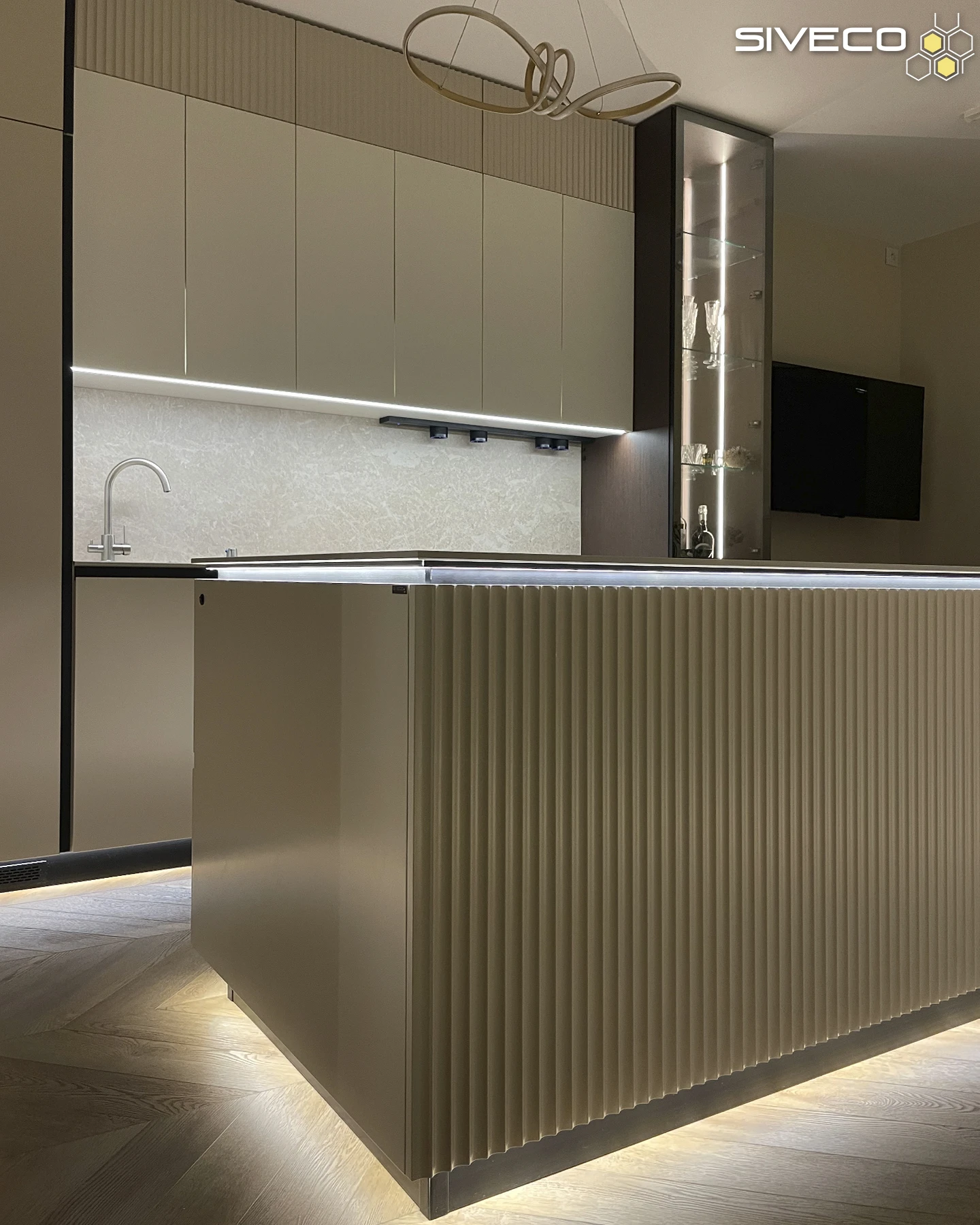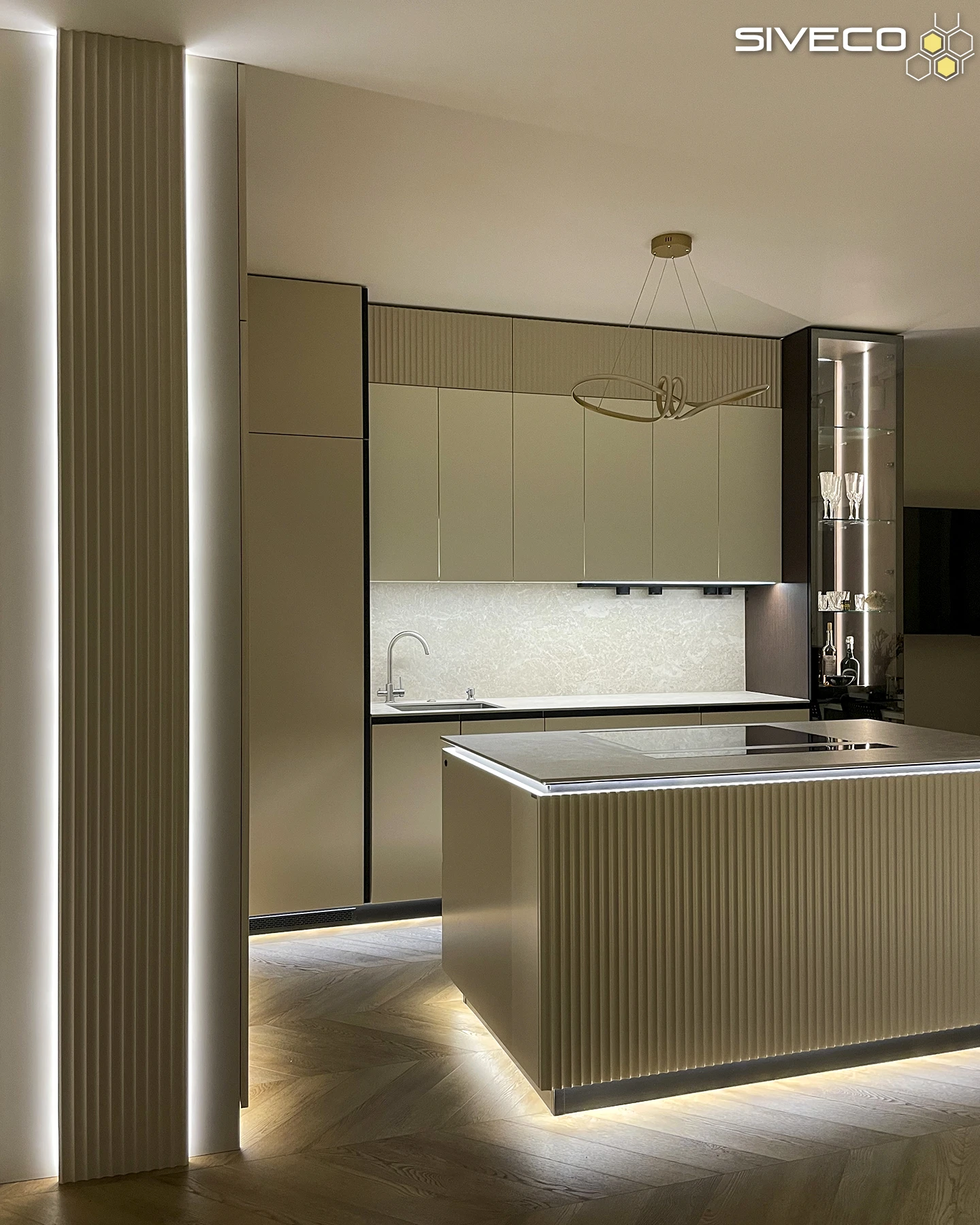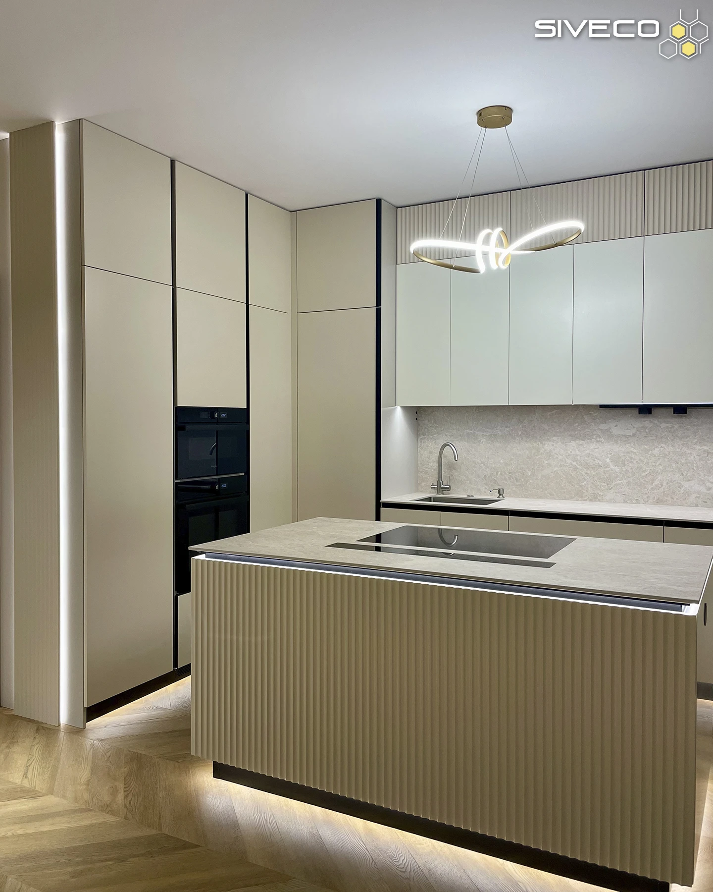 Сценарій освітлення працює на емоцію: контурна підсвітка цоколя створює ефект левітації острова, а вертикальні LED-лінії в пеналах додають глибини, перетворюючи кухню на затишний лаунж увечері.