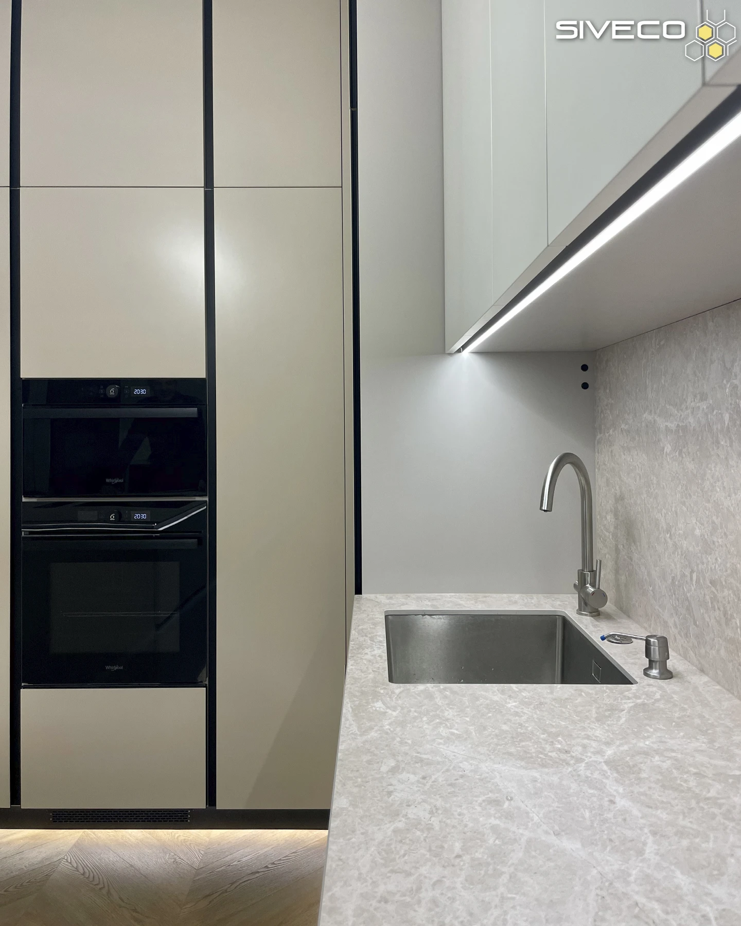 Вертикальні чорні профілі Gola виконують роль прихованих ручок і візуально «витягують» стелю. Цей суворий графічний ритм розбиває монотонність гладких фасадів, додаючи інтер'єру архітектурної чіткості.