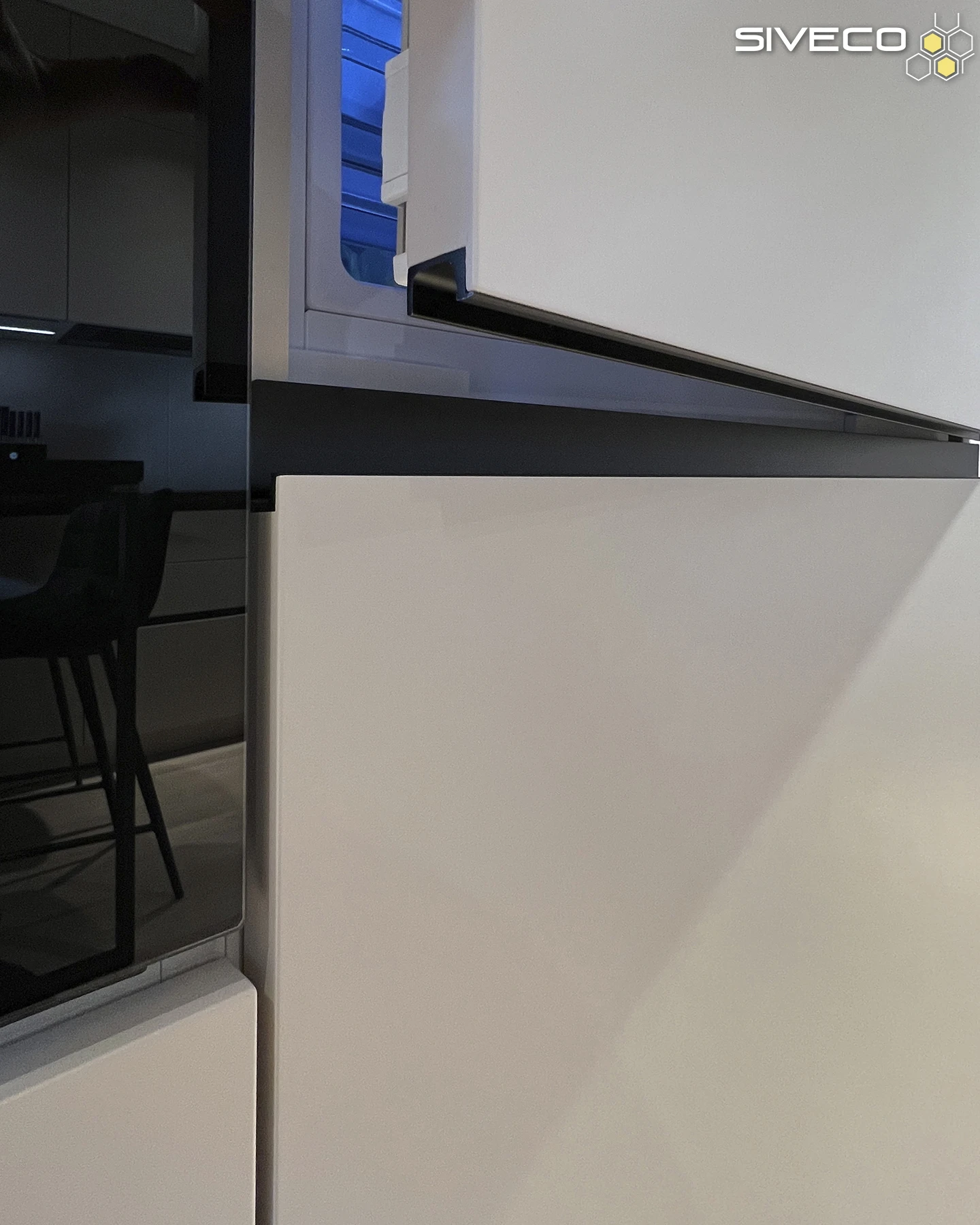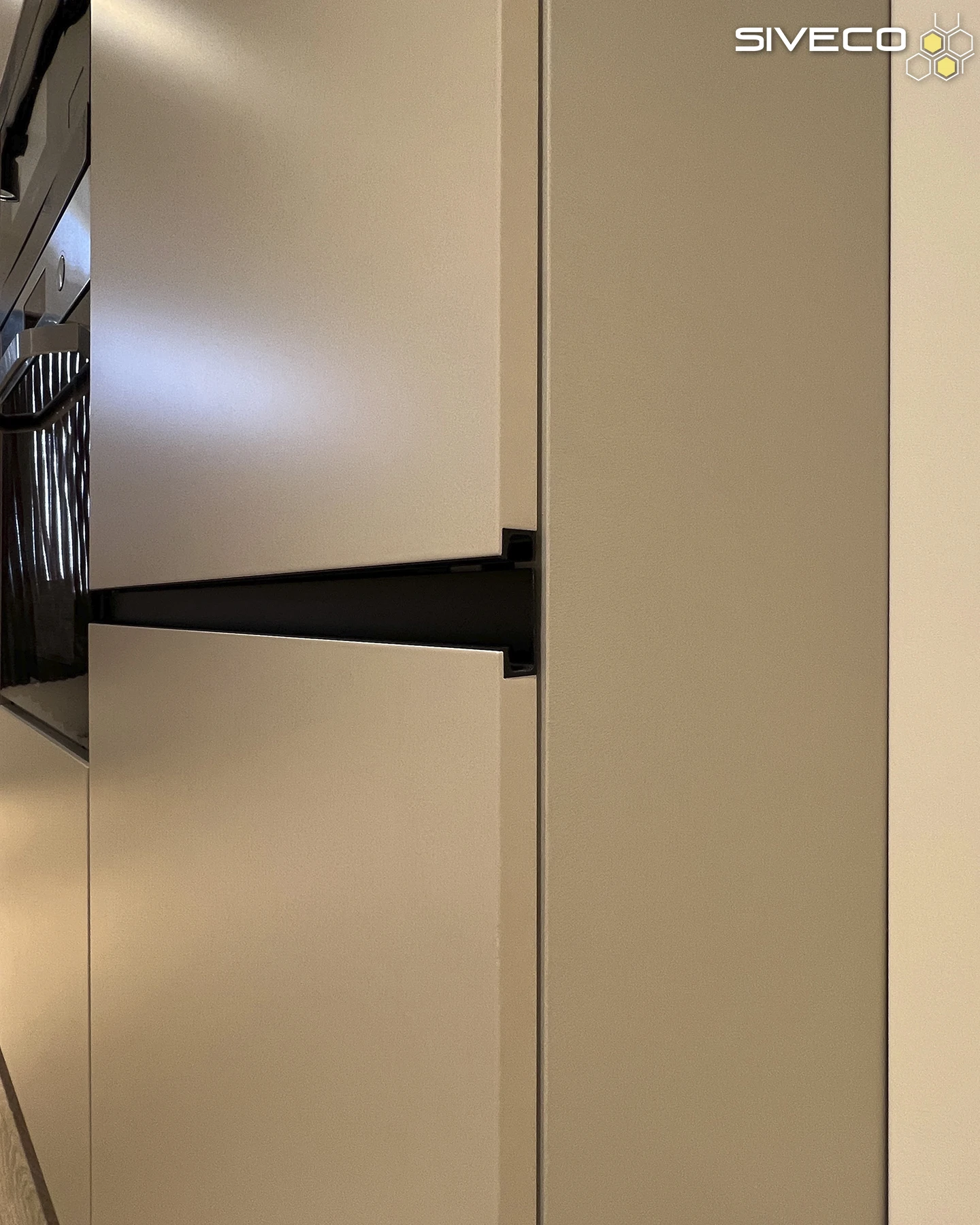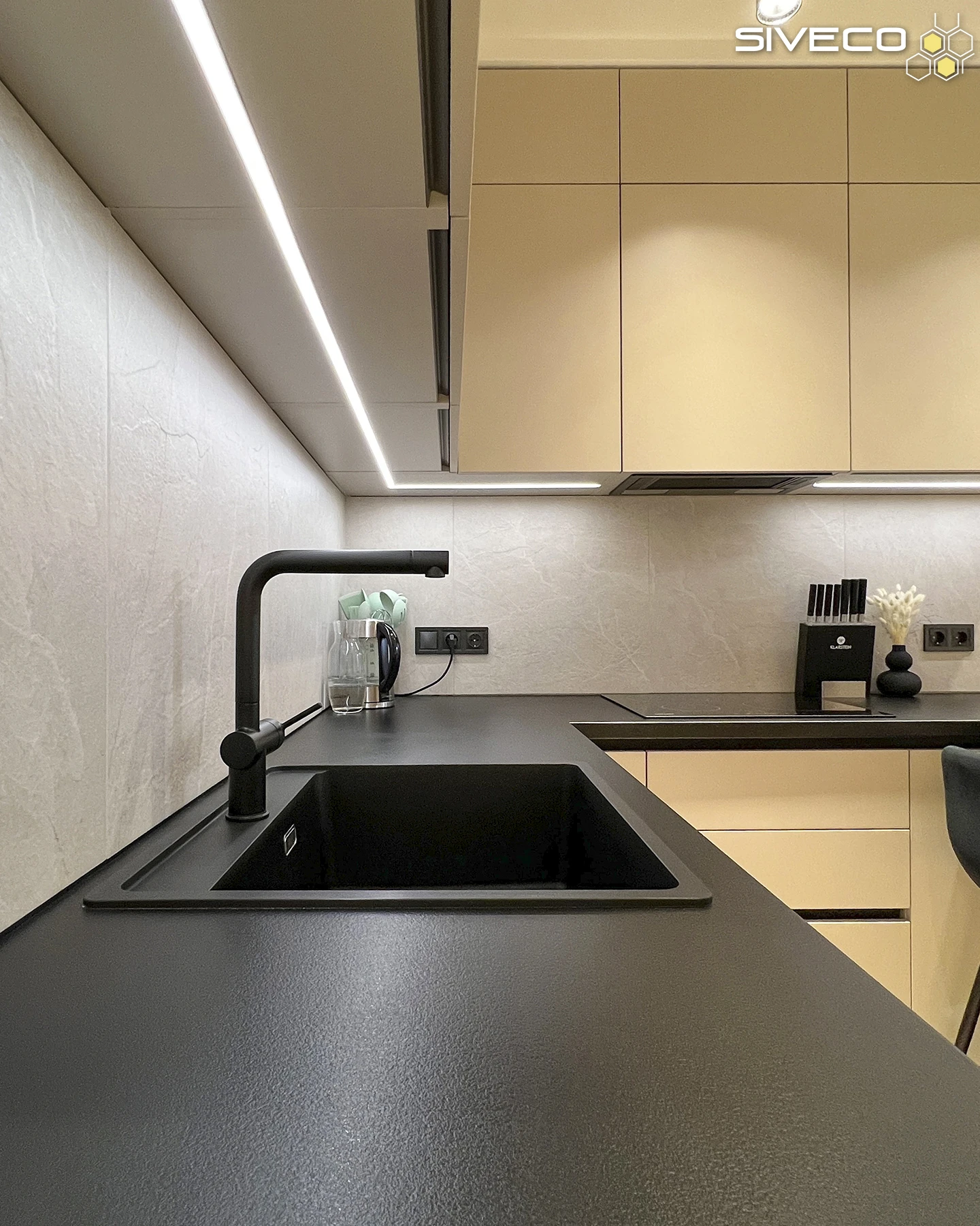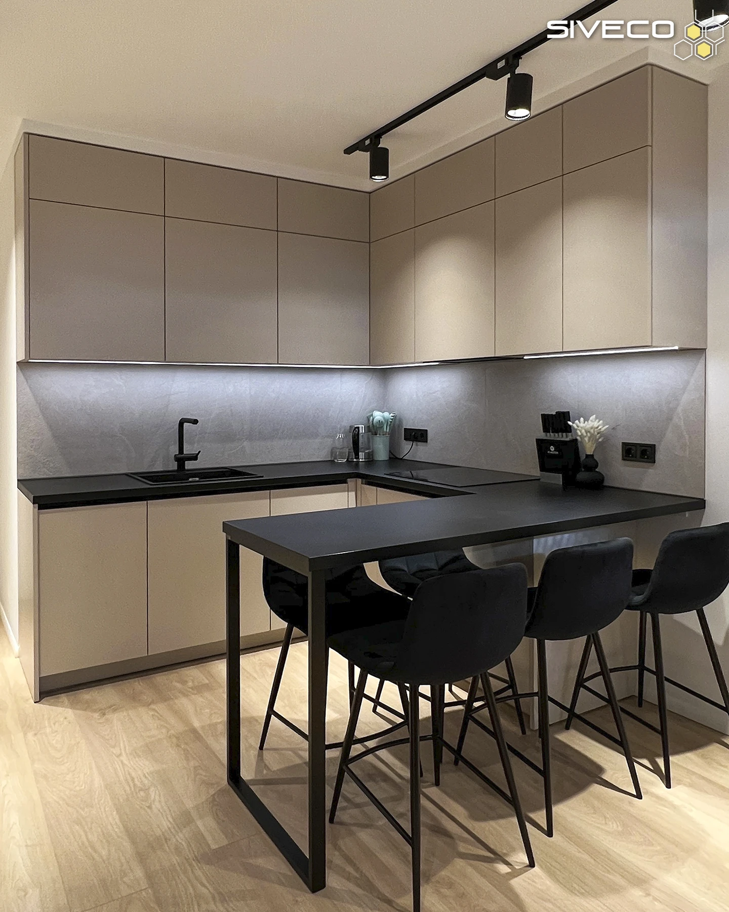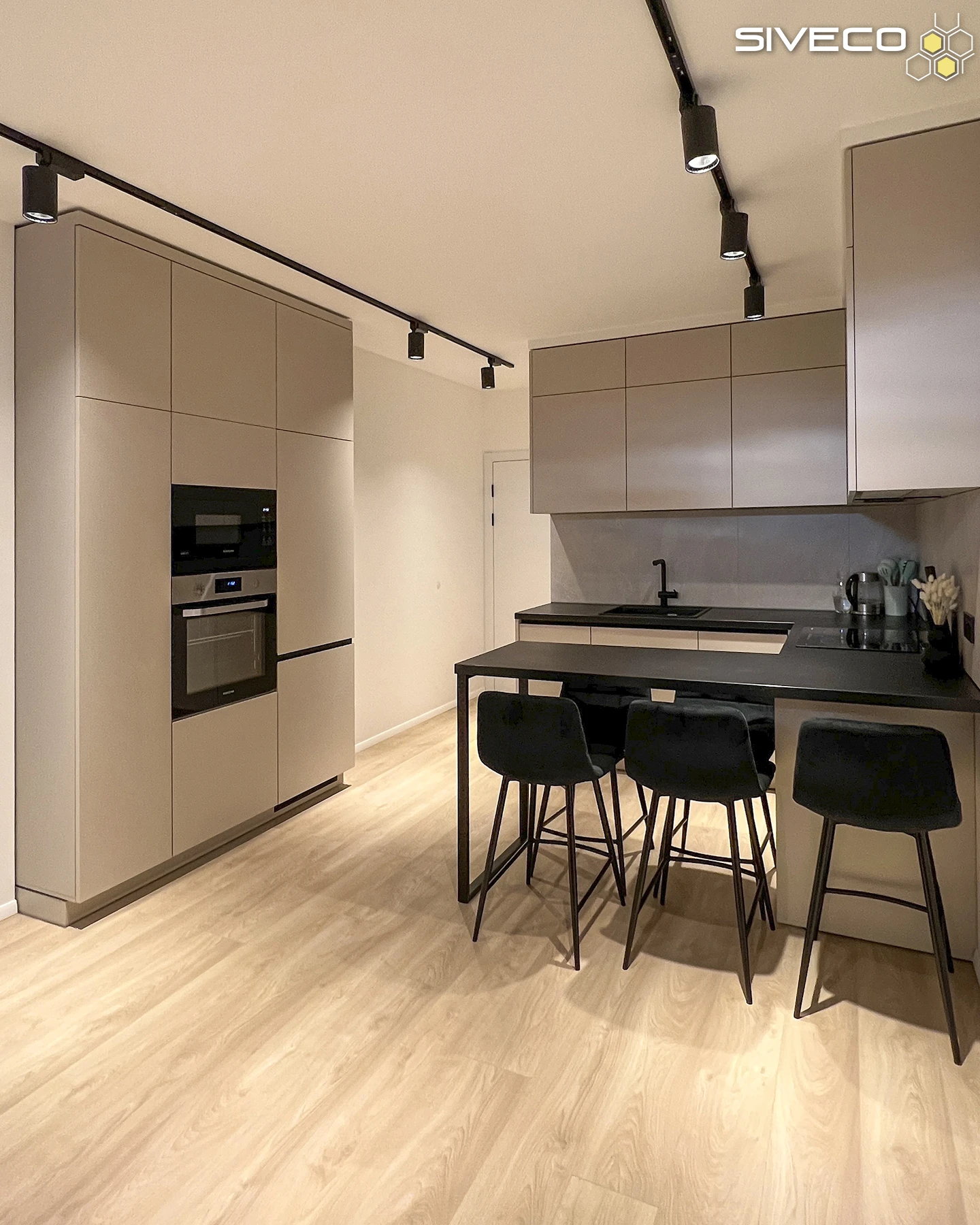 Особлива увага — чорним деталям, які задають ритм: трекові світильники, змішувач, побутова техніка та профіль Gola (приховані ручки). Це виглядає стильно і сучасно.