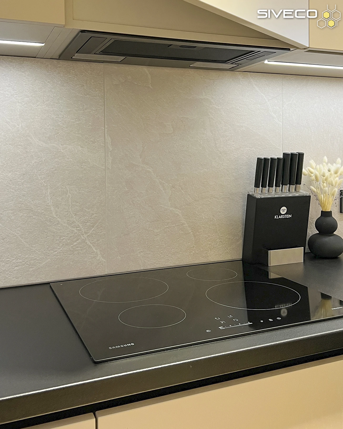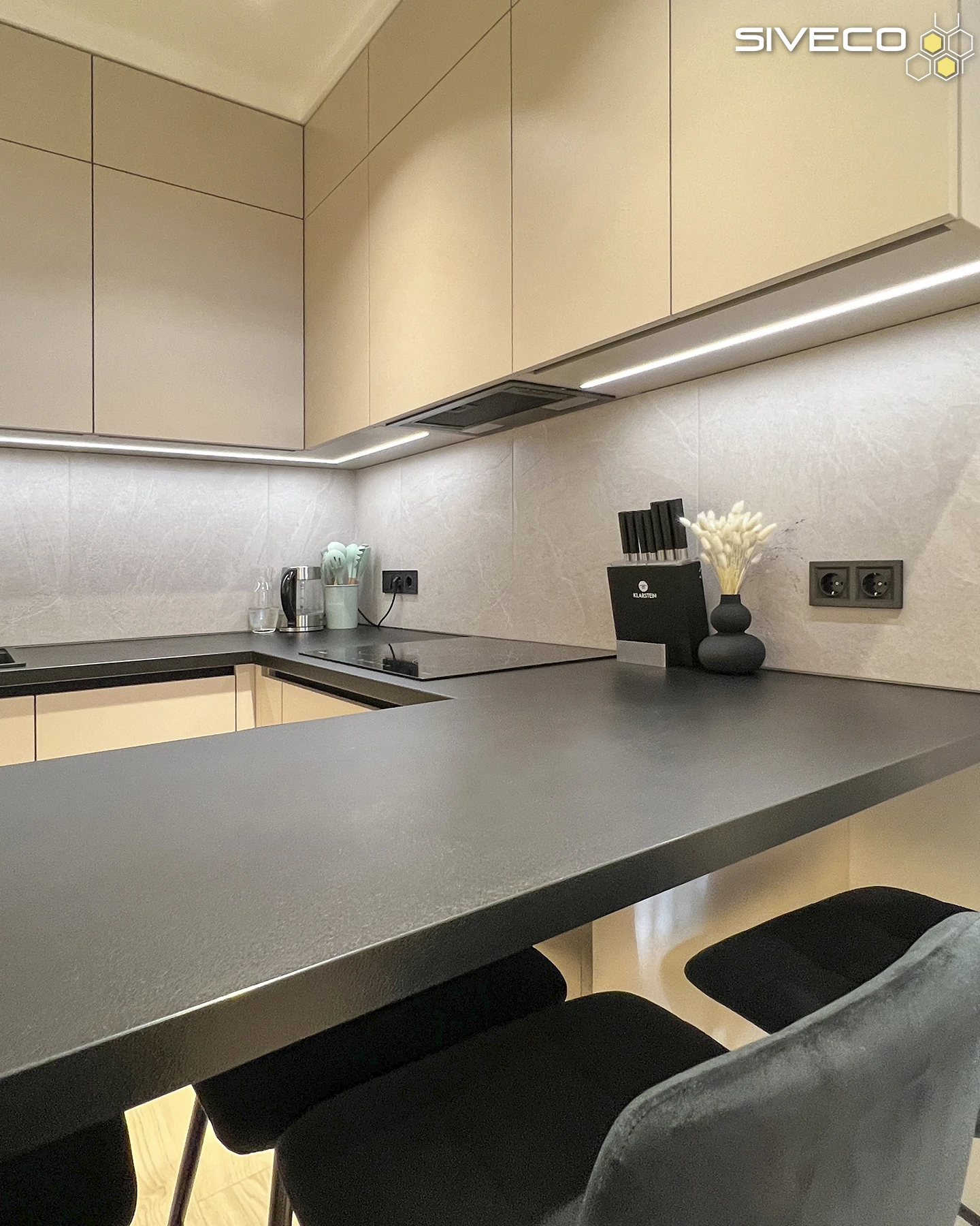 Таке рішення робить інтер'єр «м'яким» та домашнім. Але щоб кухня не виглядала надто простою, ми додали брутальних ноток: фартух з імітацією сірого каменю та тонку чорну стільницю, яка створює чіткий візуальний контур.