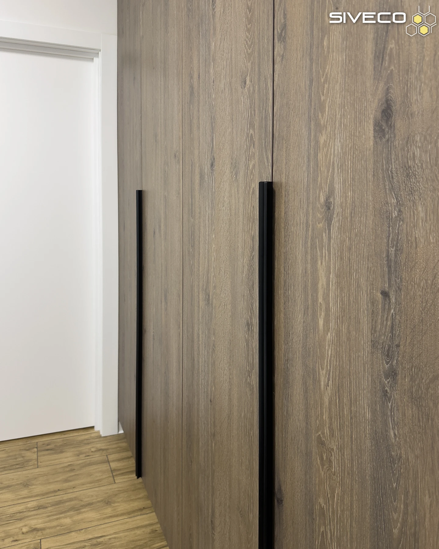 Контрастні чорні вертикальні ручки-профілі є не тільки зручним елементом, але й важливим графічним акцентом. Вони підкреслюють сучасний характер меблів і візуально "витягують" конструкцію вгору, посилюючи ефект високих стель.