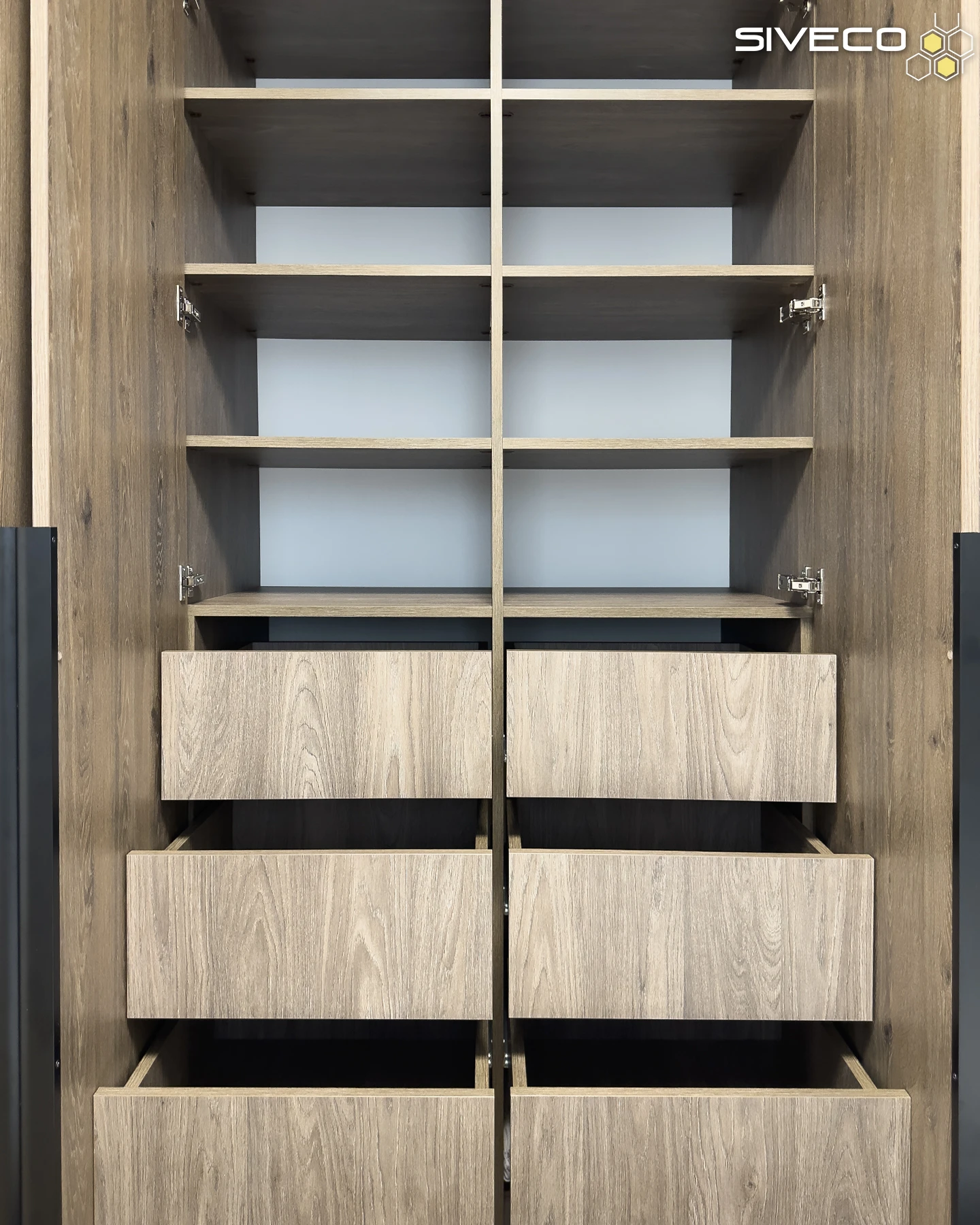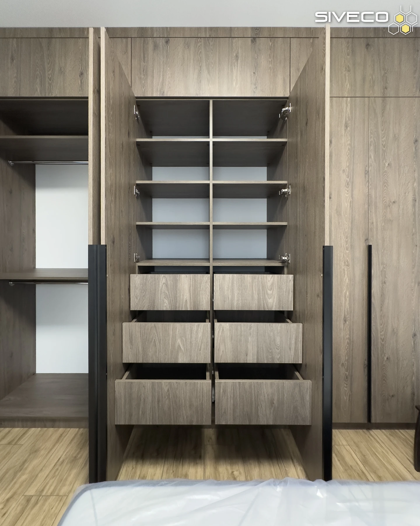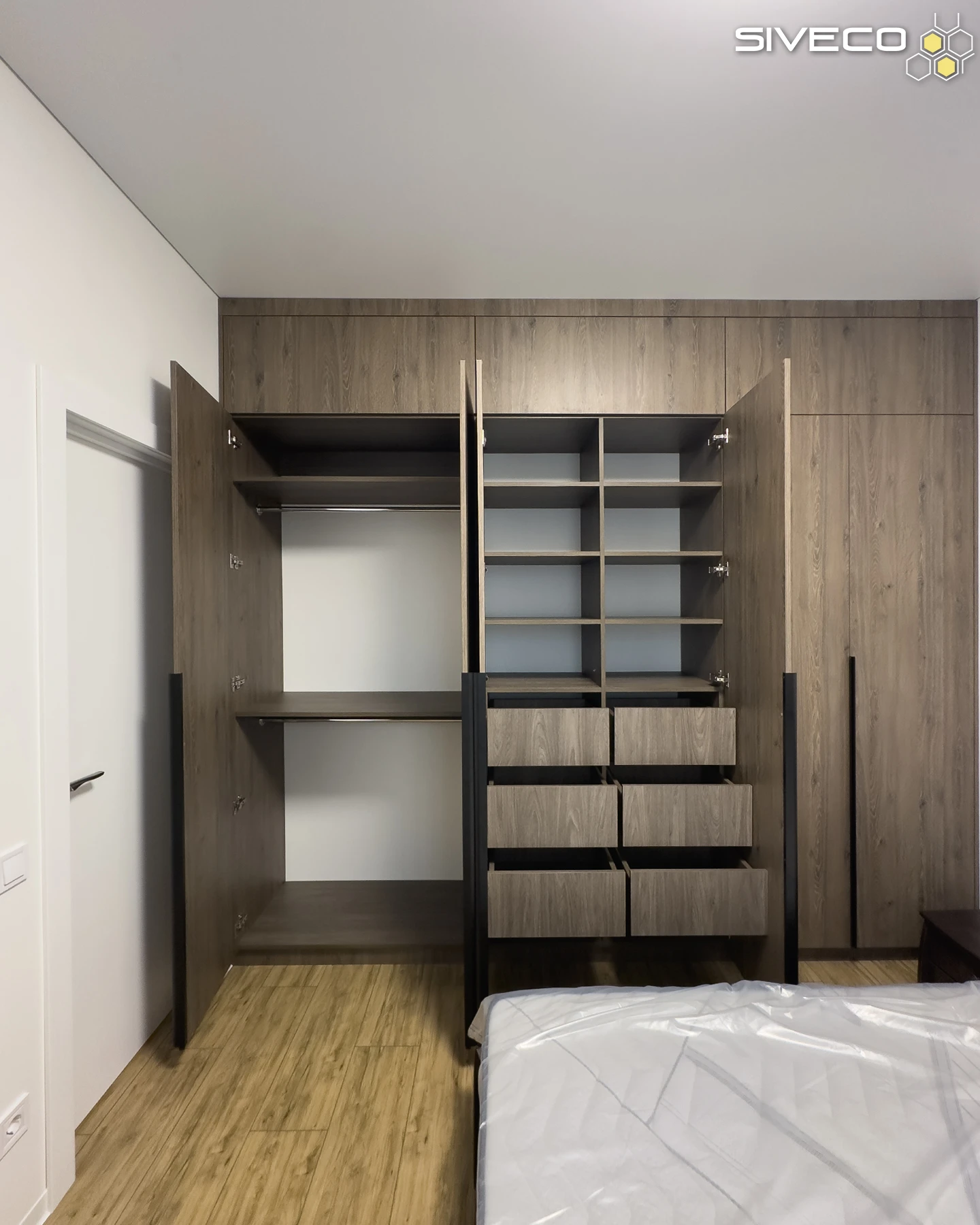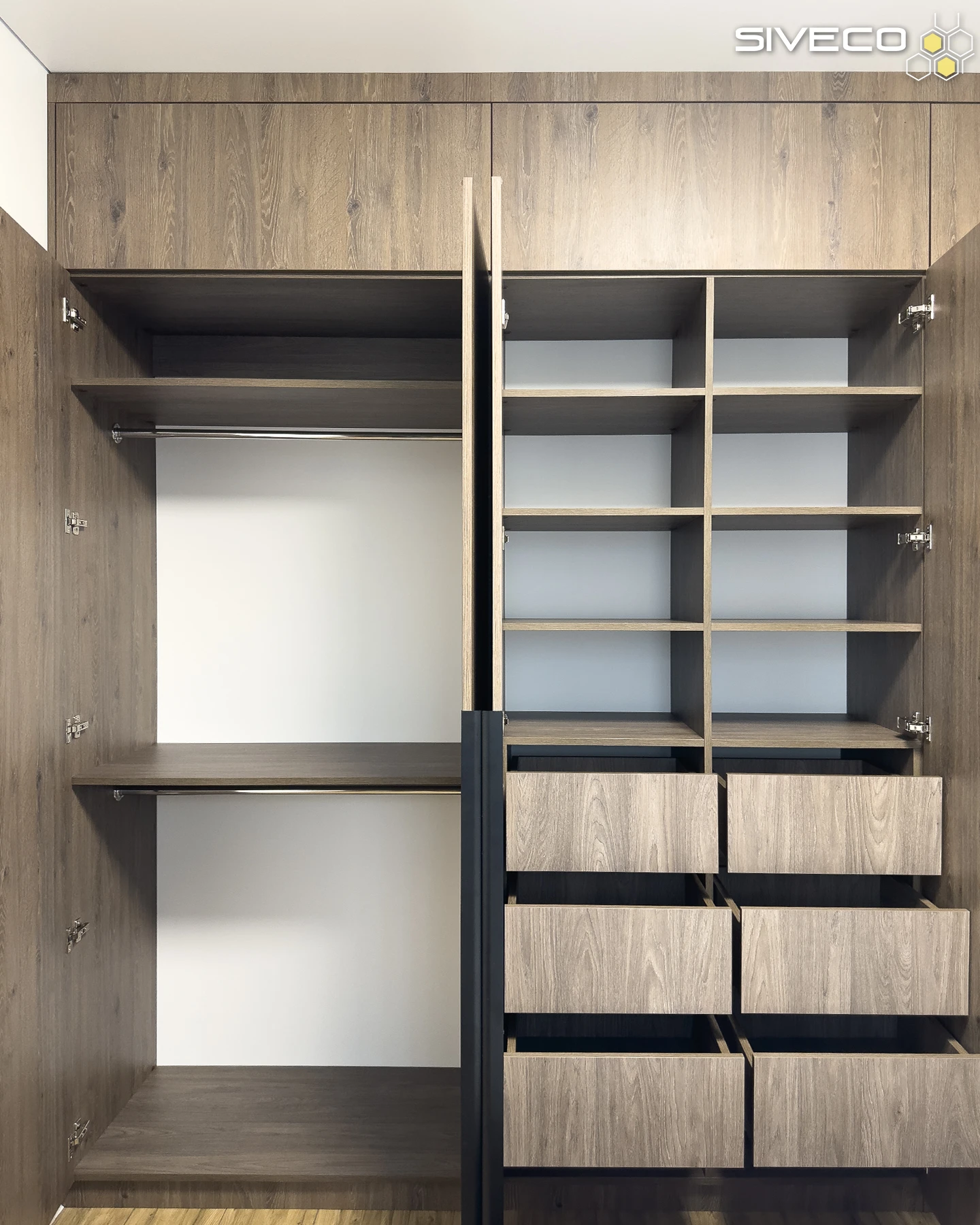 Шафа спроєктована з акцентом на максимальну ергономіку та місткість. Секція з відкритими полицями та висувними ящиками інтегрована безпосередньо в основну конструкцію, забезпечуючи зручний доступ до найнеобхідніших речей біля ліжка.