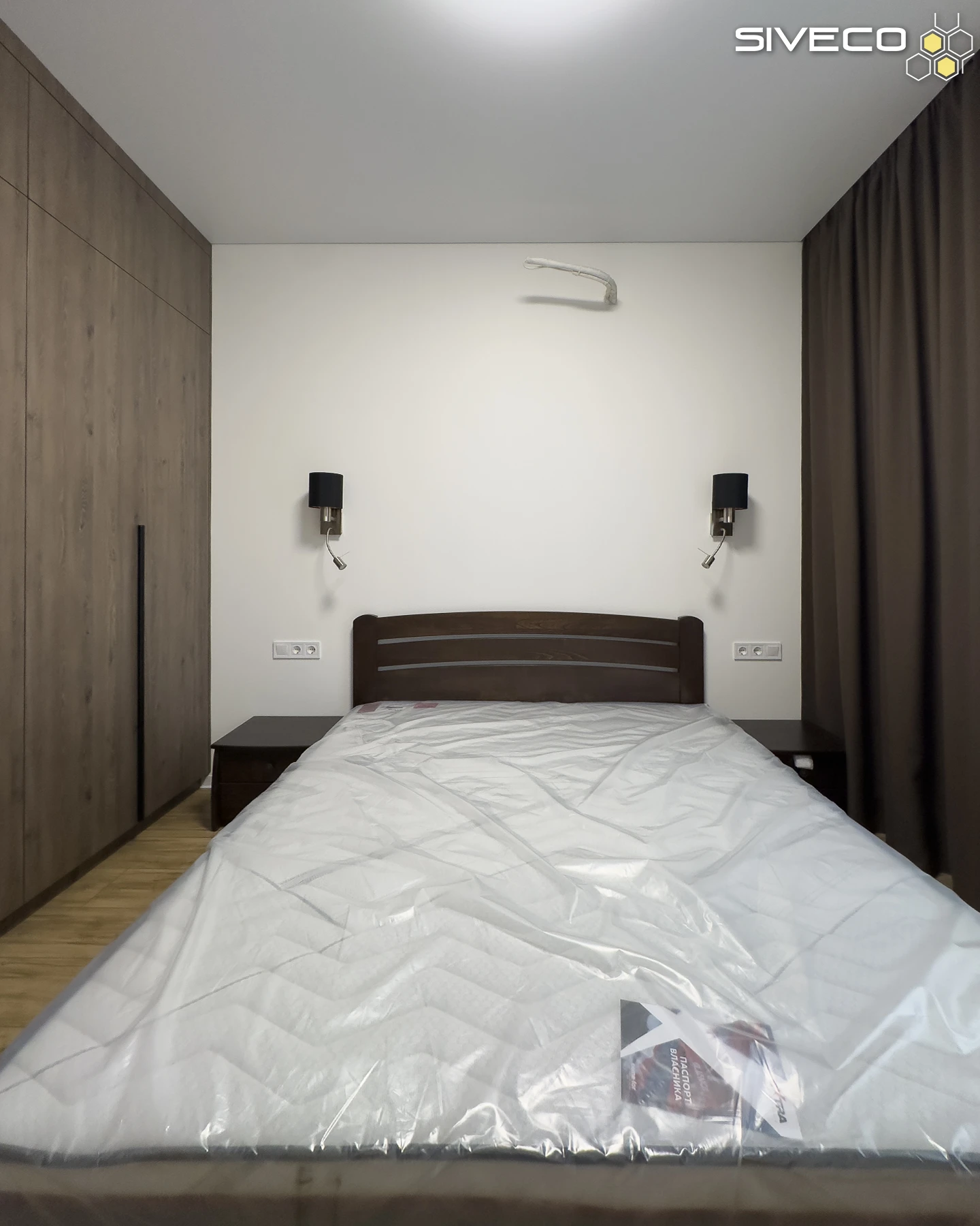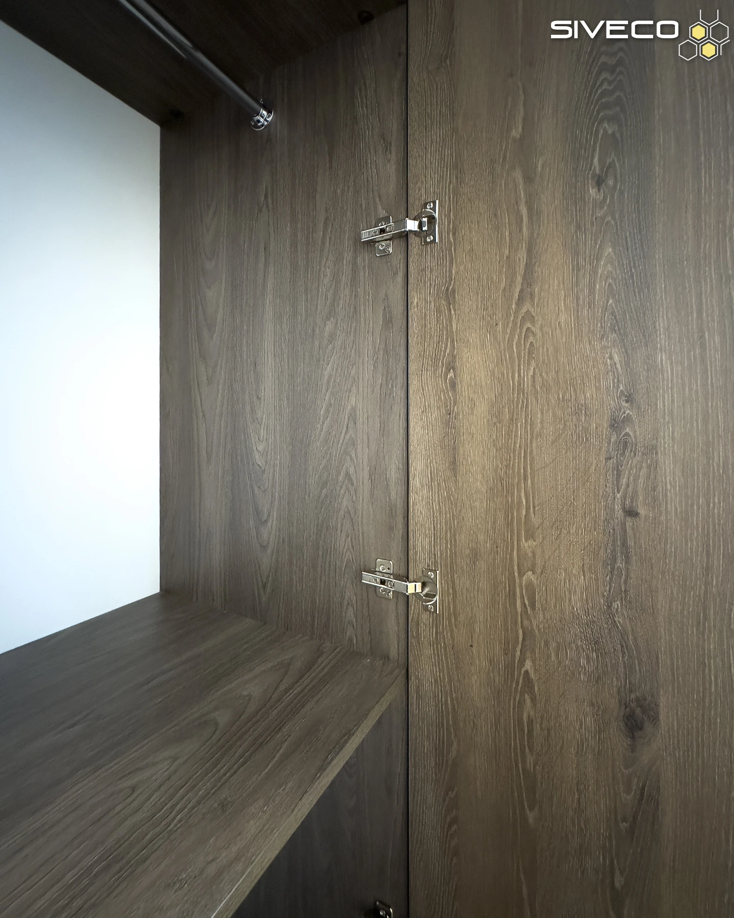 Внутрішні секції шафи виконані у більш глибокому, насиченому відтінку темного дерева. Цей прийом додає глибини та елегантності, а також контрастує зі світлими стінами та дерев'яною підлогою, роблячи внутрішнє наповнення візуально "чистим" і впорядкованим.
