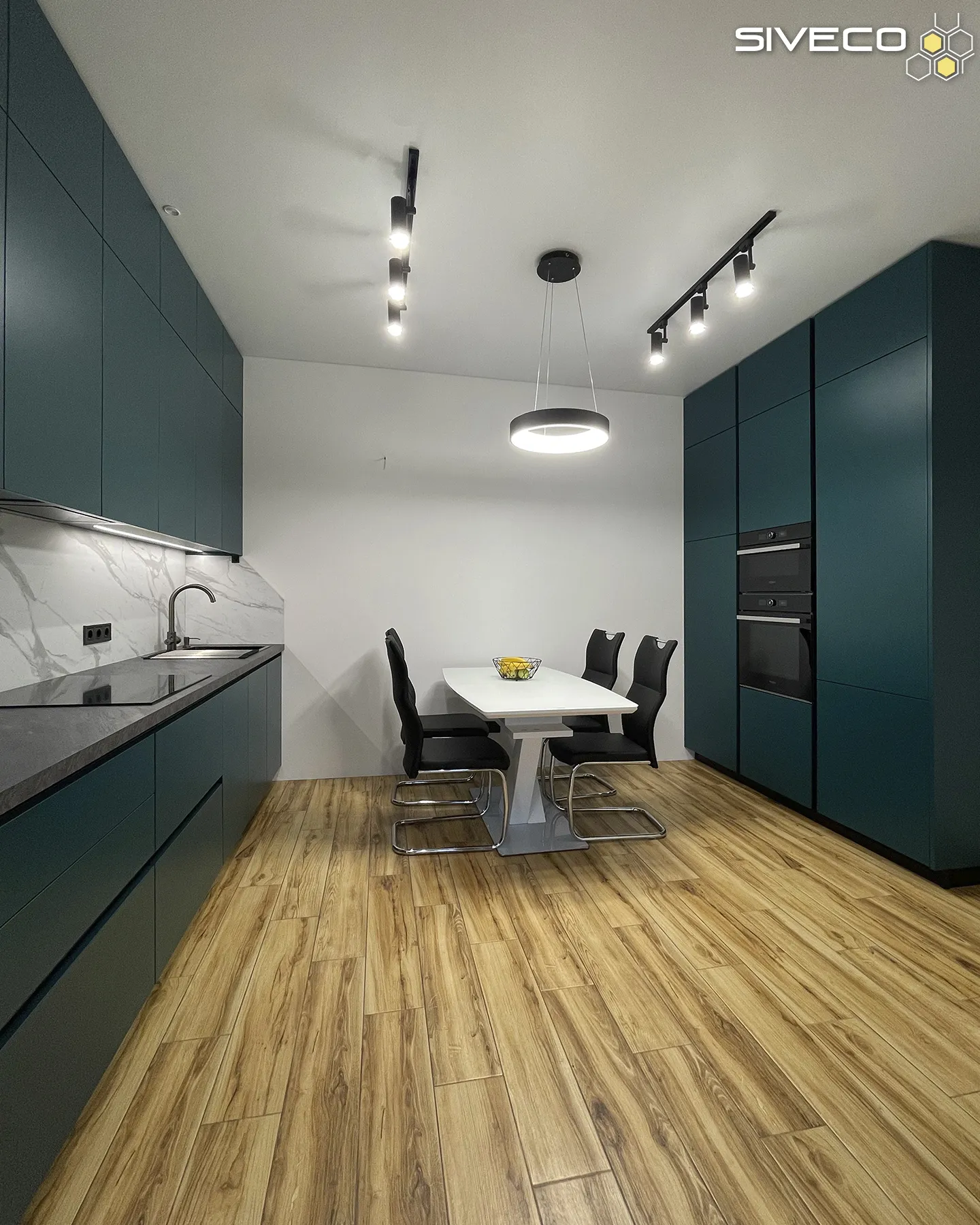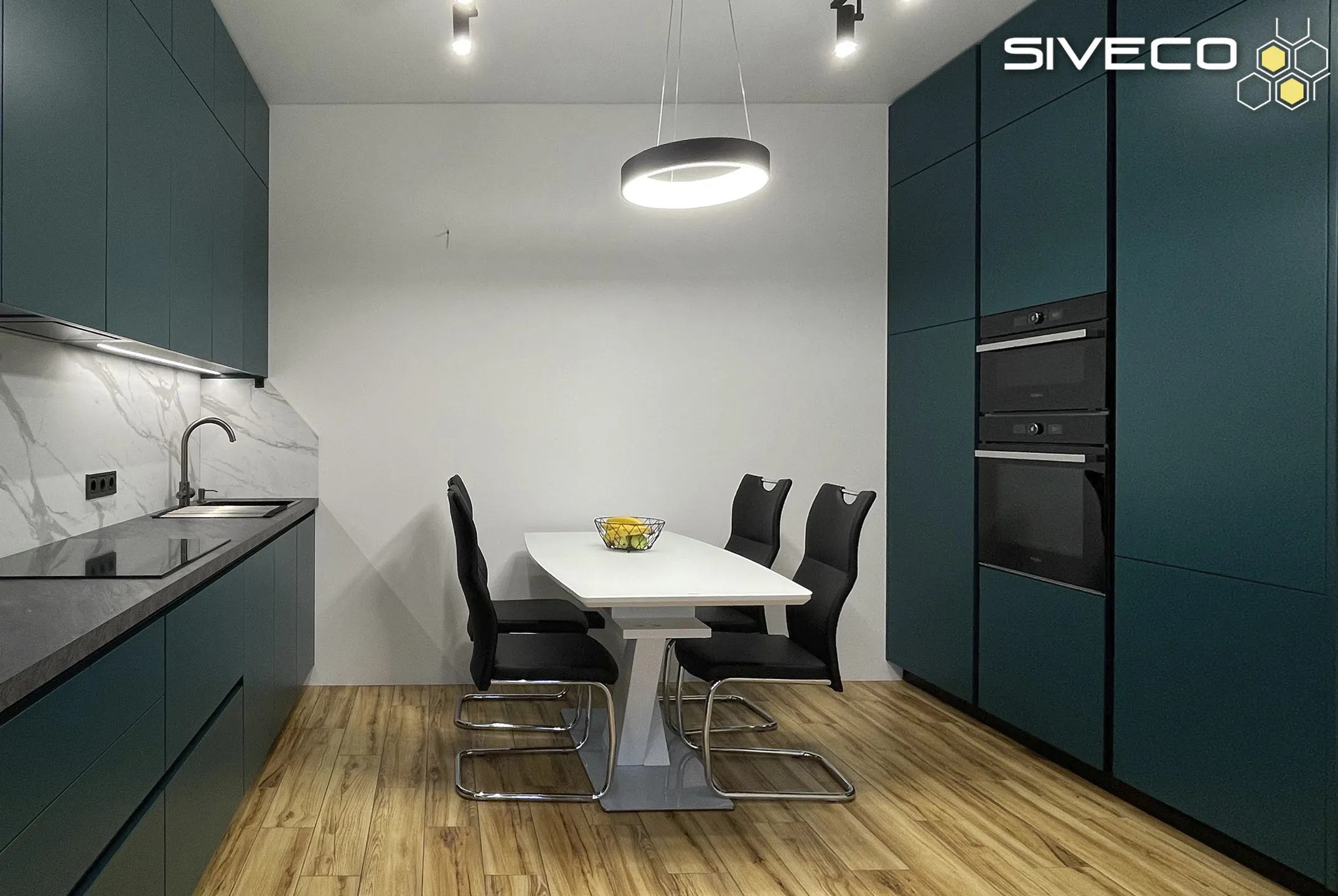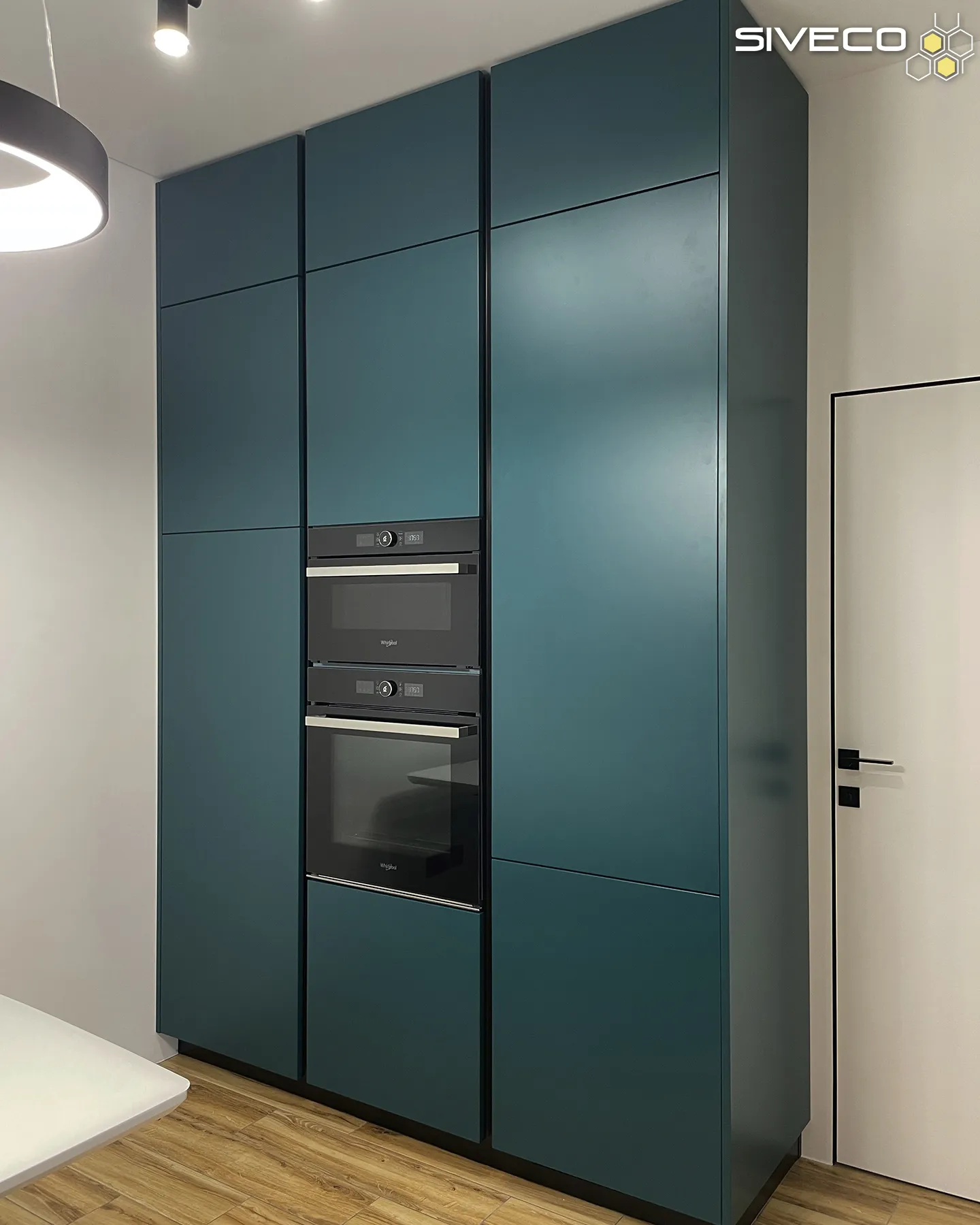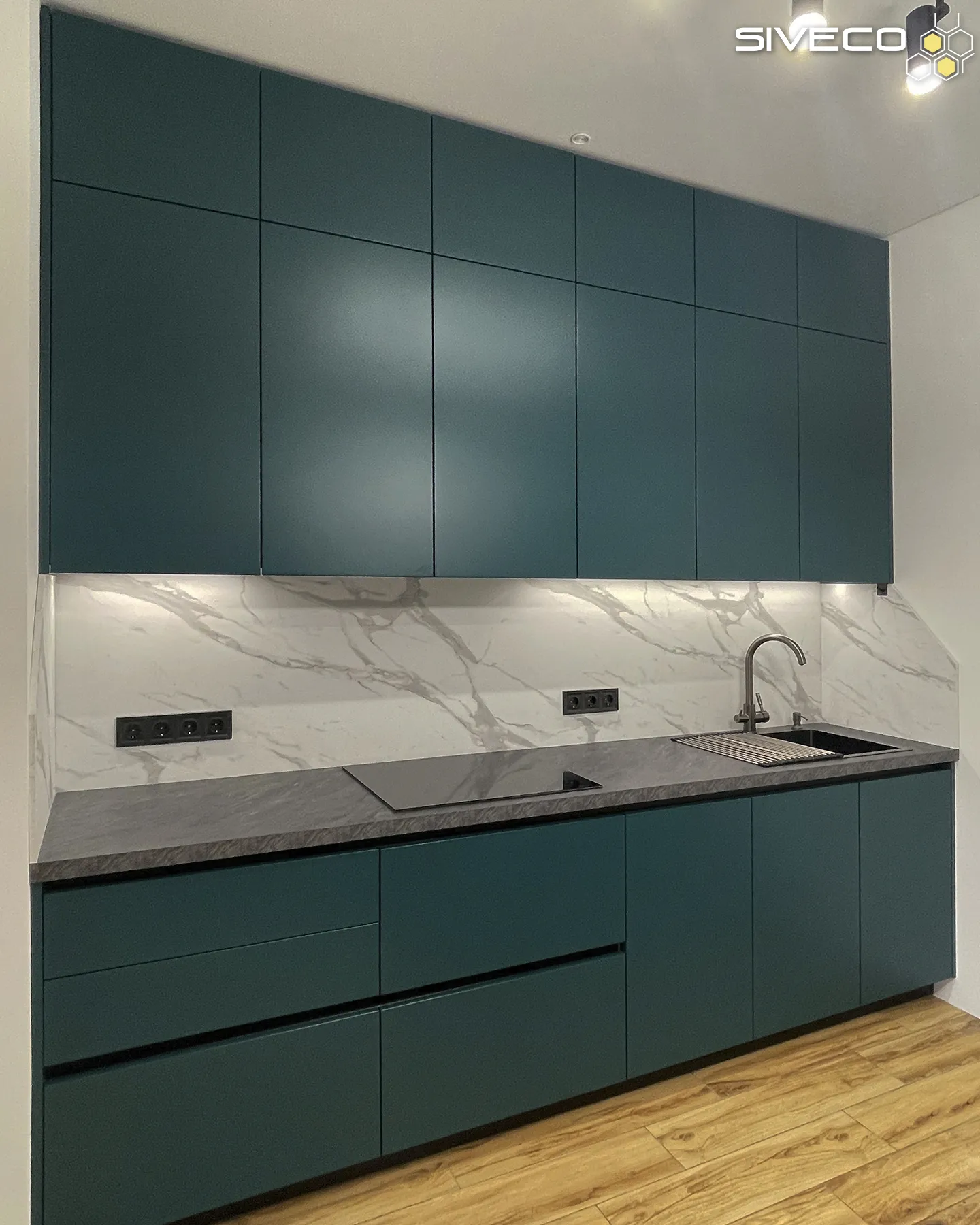 Акцентна кухня з матовими фасадами насиченого смарагдового кольору.