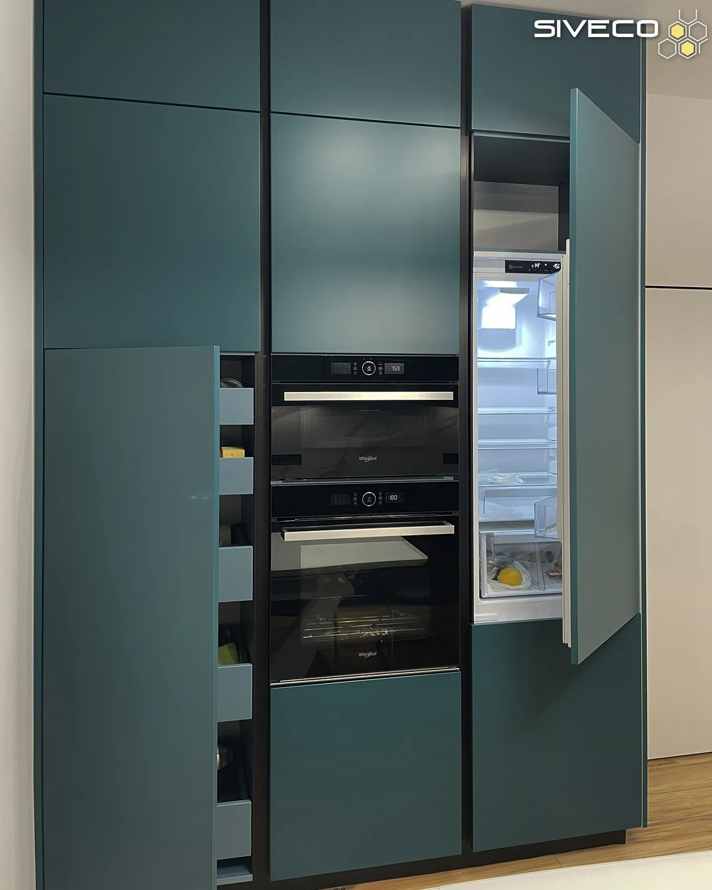 Високі колони-пенали з вбудованим холодильником та технікою збирають усе необхідне в одній зоні.