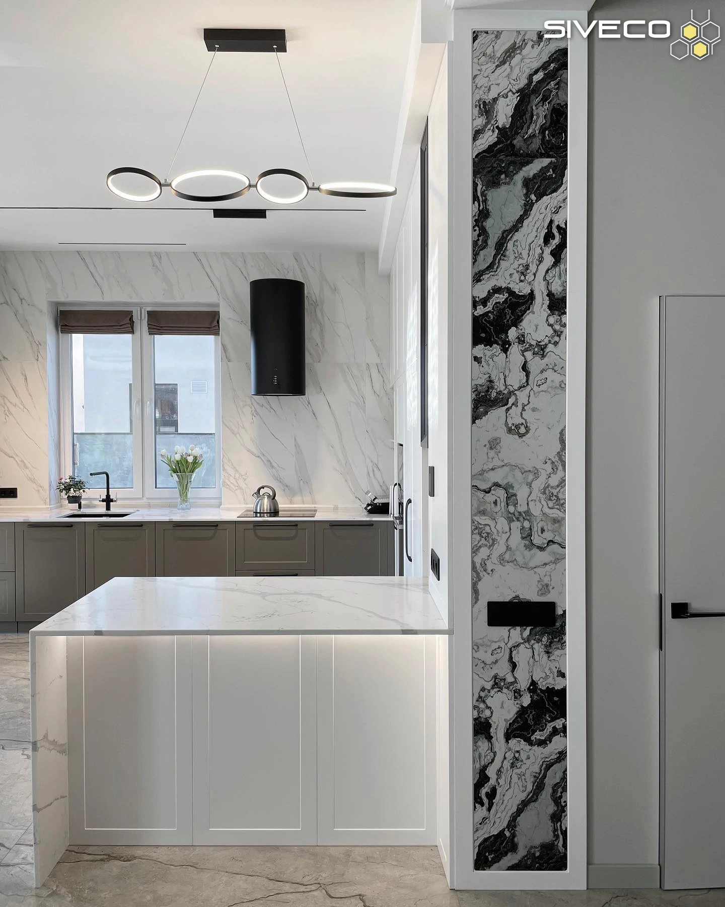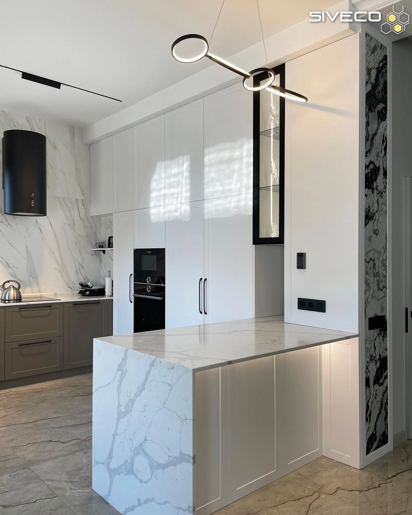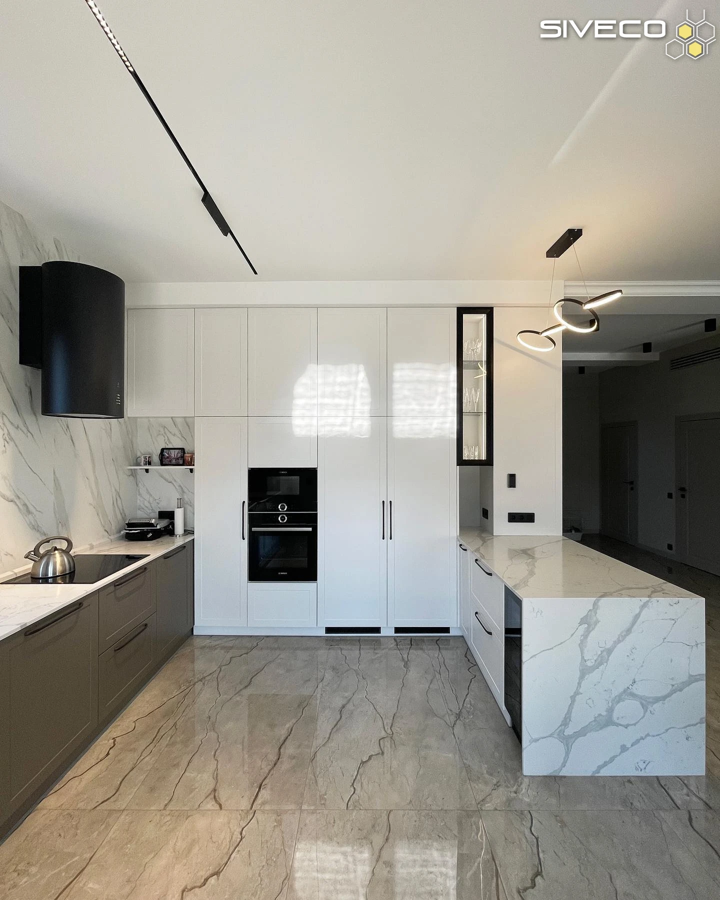Центральний елемент — острів з ефектом «waterfall» (стільниця переходить у боковину), що повторює малюнок мармуру на підлозі та фартуху. Таке рішення створює візуальну цілісність, де меблі та оздоблення працюють як єдиний ансамбль, а чорні графічні акценти (ручки, техніка, витяжка) додають композиції динаміки.