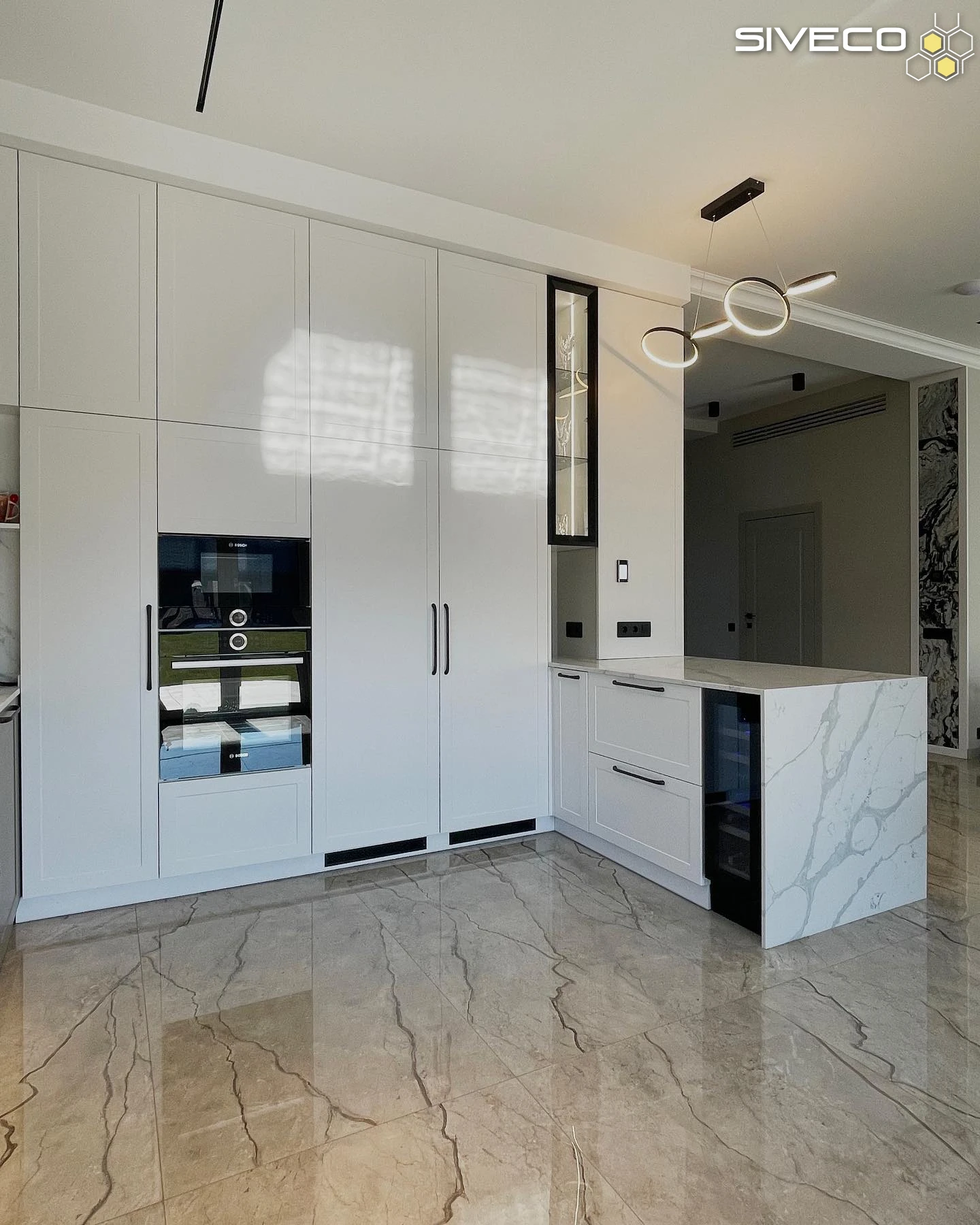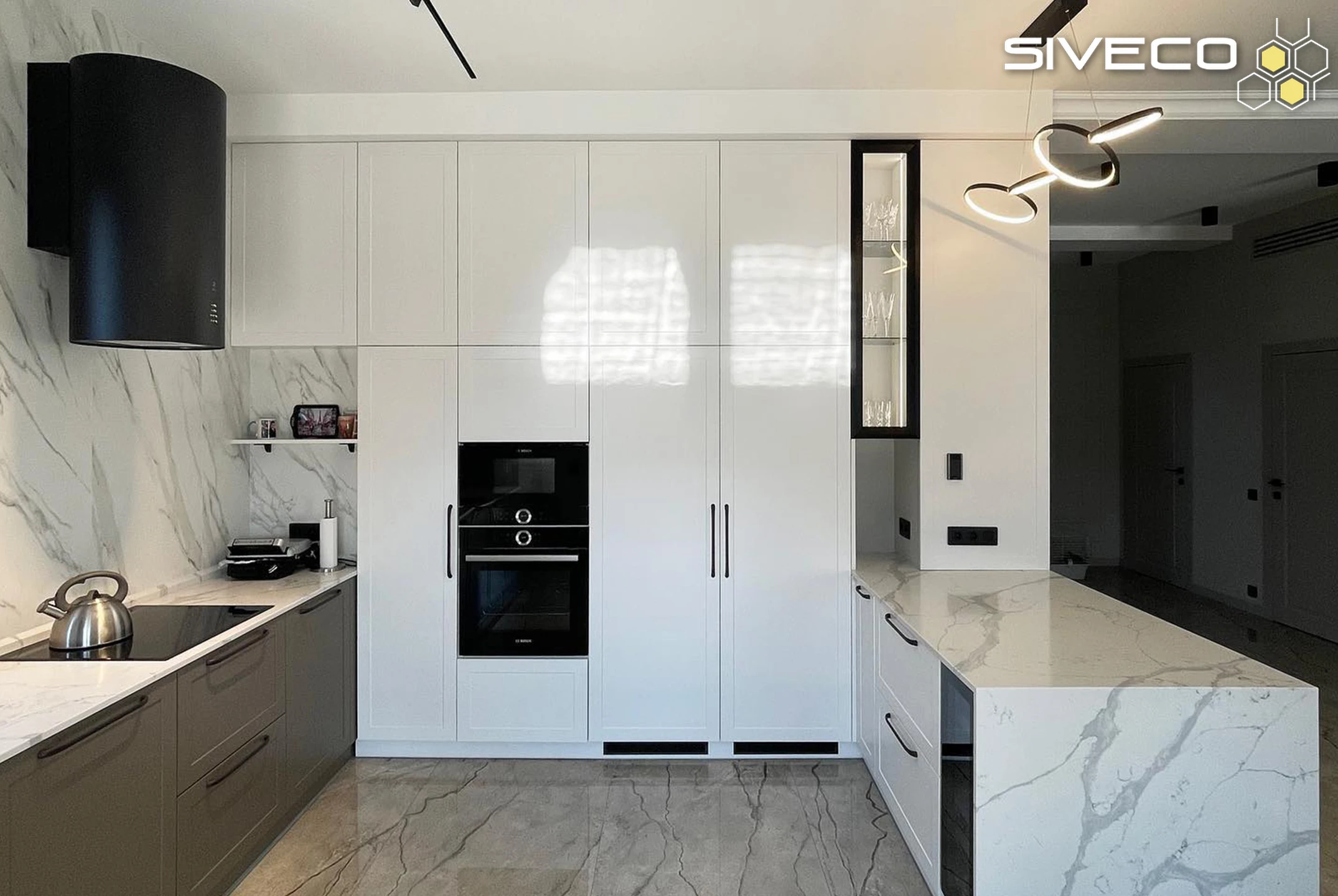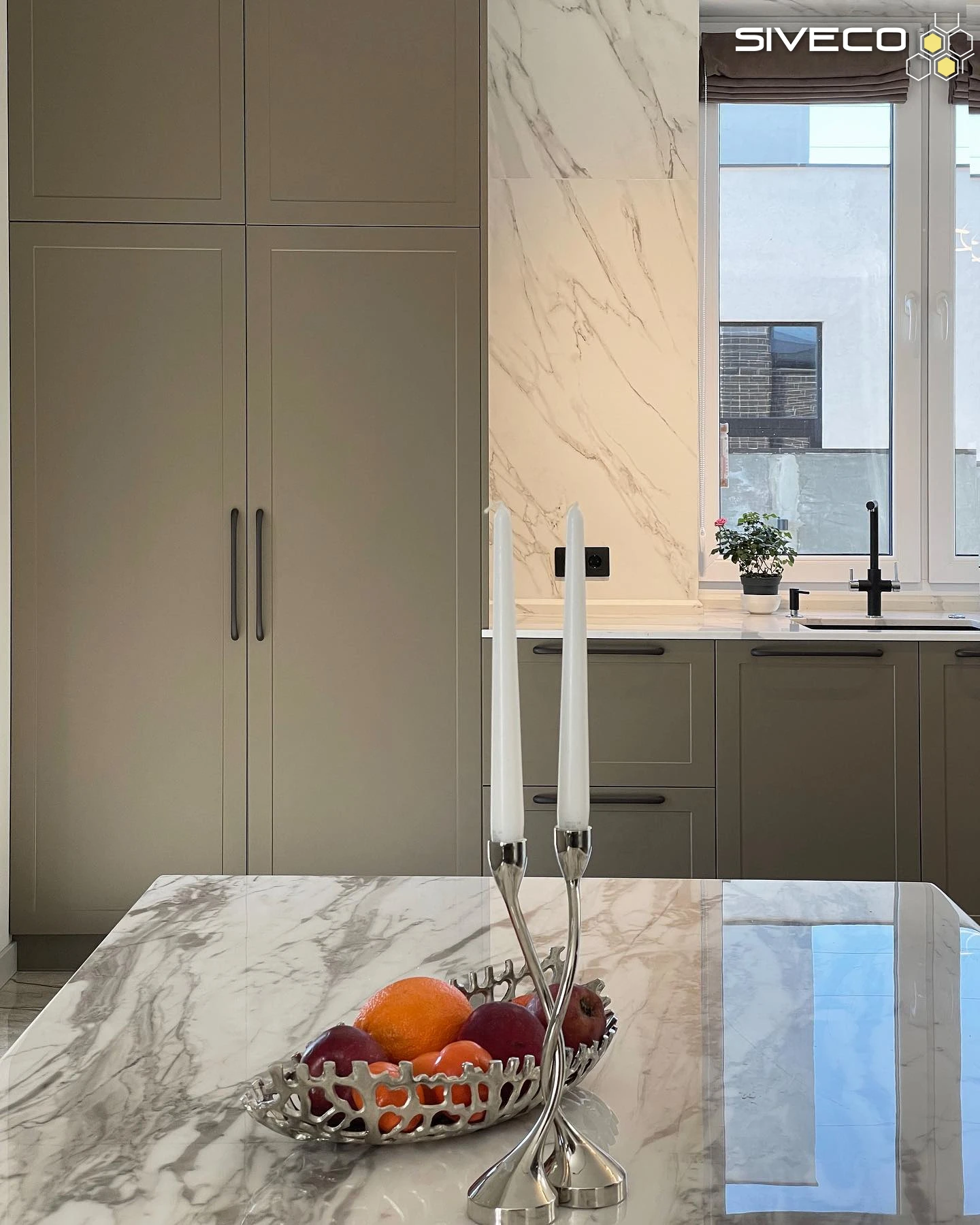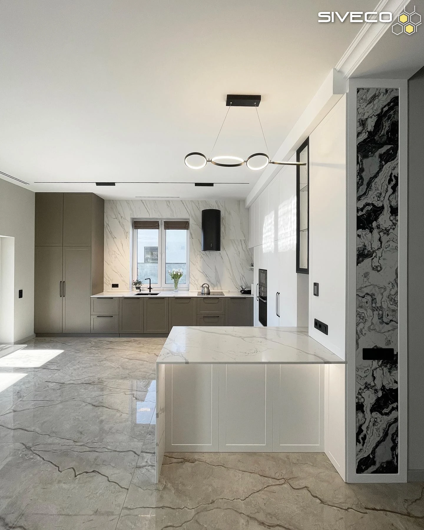 Центральний елемент — острів з ефектом «waterfall» (стільниця переходить у боковину), що повторює малюнок мармуру на підлозі та фартуху. Таке рішення створює візуальну цілісність, де меблі та оздоблення працюють як єдиний ансамбль, а чорні графічні акценти (ручки, техніка, витяжка) додають композиції динаміки.