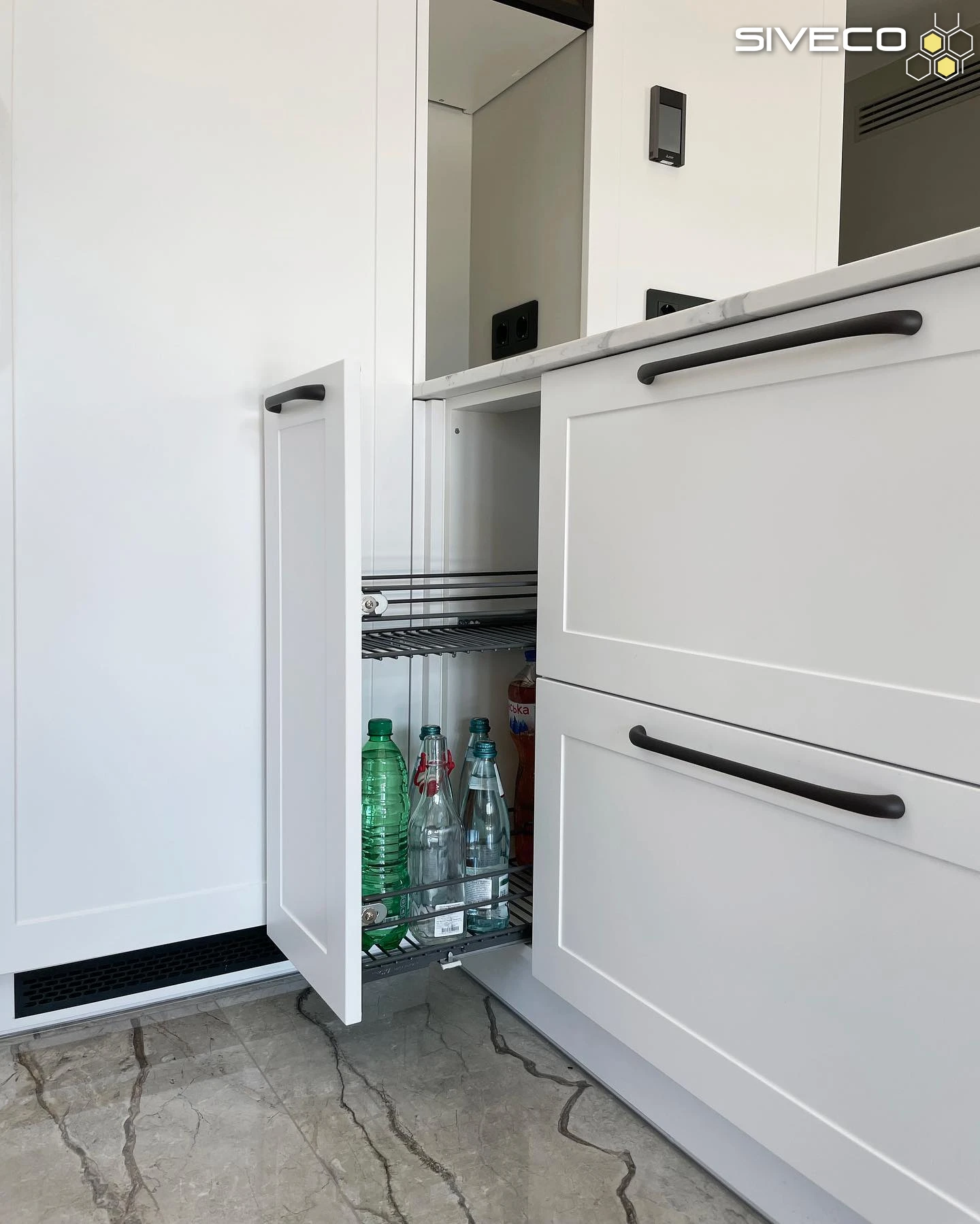 За естетикою фасаду прихована безкомпромісна функціональність. Кухня спроектована за принципом «розумного зберігання»: тут реалізовані глибокі висувні шухляди для важкого посуду, вузькі карго-системи для пляшок та спецій, а також приховані ніші для дрібної побутової техніки, щоб стільниця завжди залишалася вільною.