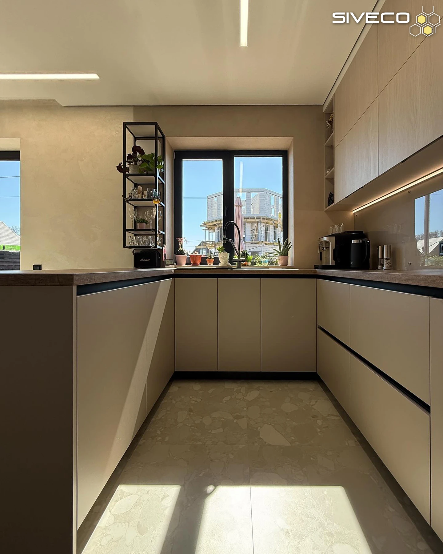 Увага до деталей — сильна сторона цієї кухні. Відкритий чорний металевий стелаж біля вікна додає легку нотку лофту, не обтяжуючи простір. Чорна побутова техніка та врізні профільні ручки створюють стильний графічний контраст, підкреслюючи геометрію меблів.