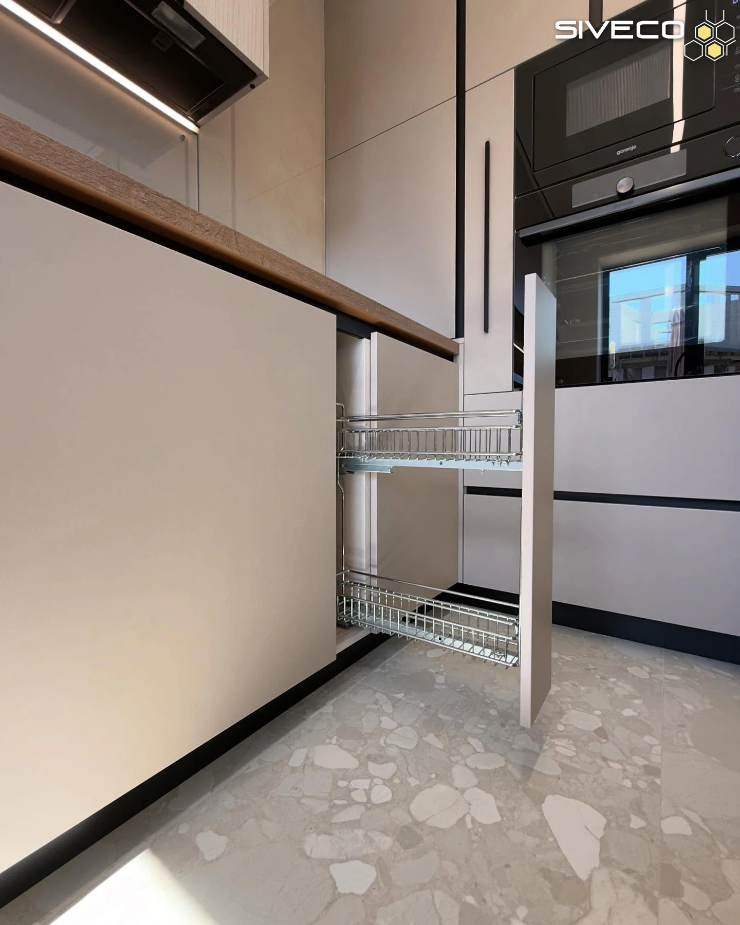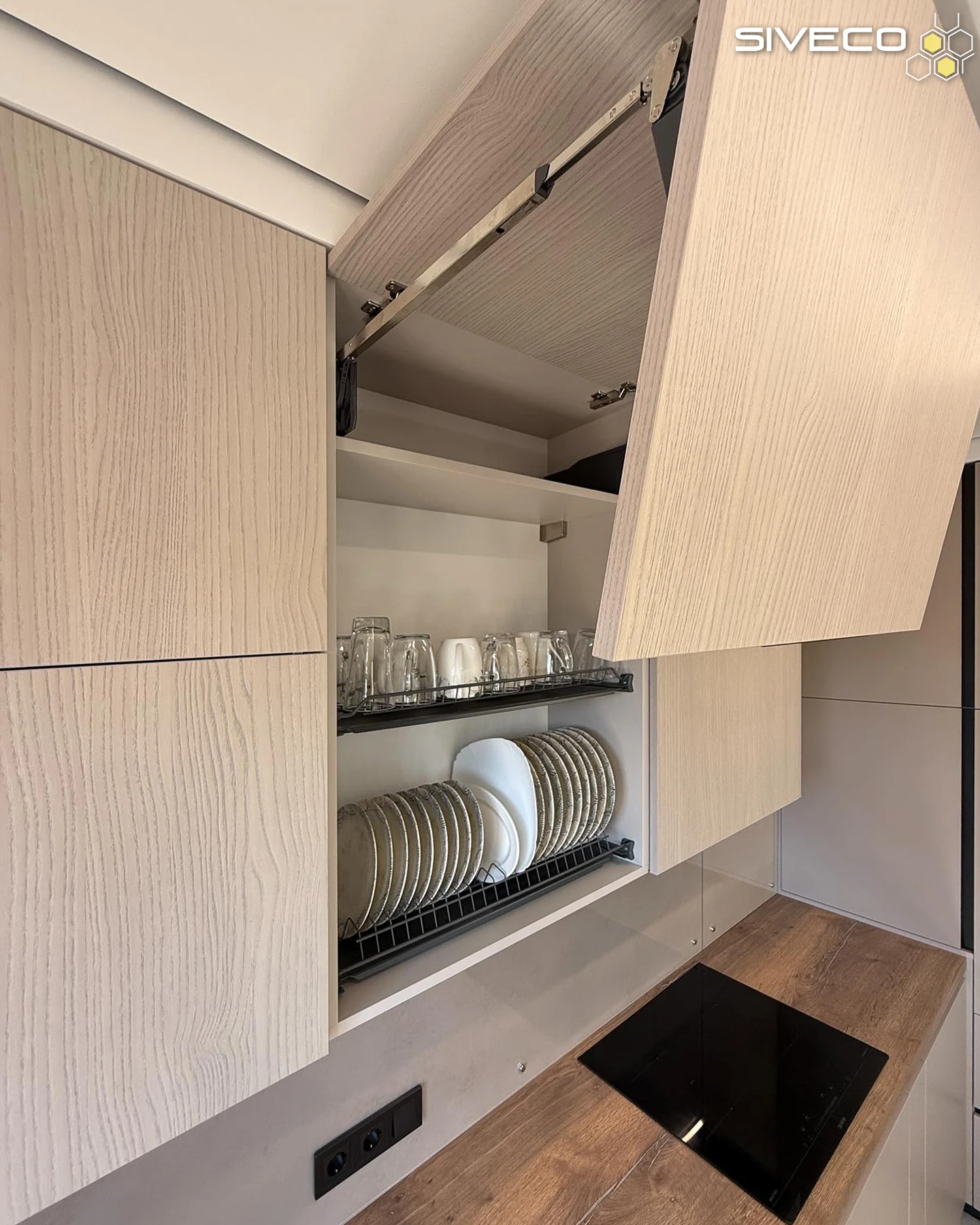 Всередині кухня так само продумана, як і ззовні: використані висувні системи карго (пляшківниці) та сучасні сушки для посуду, що гарантує зручний доступ до речей.