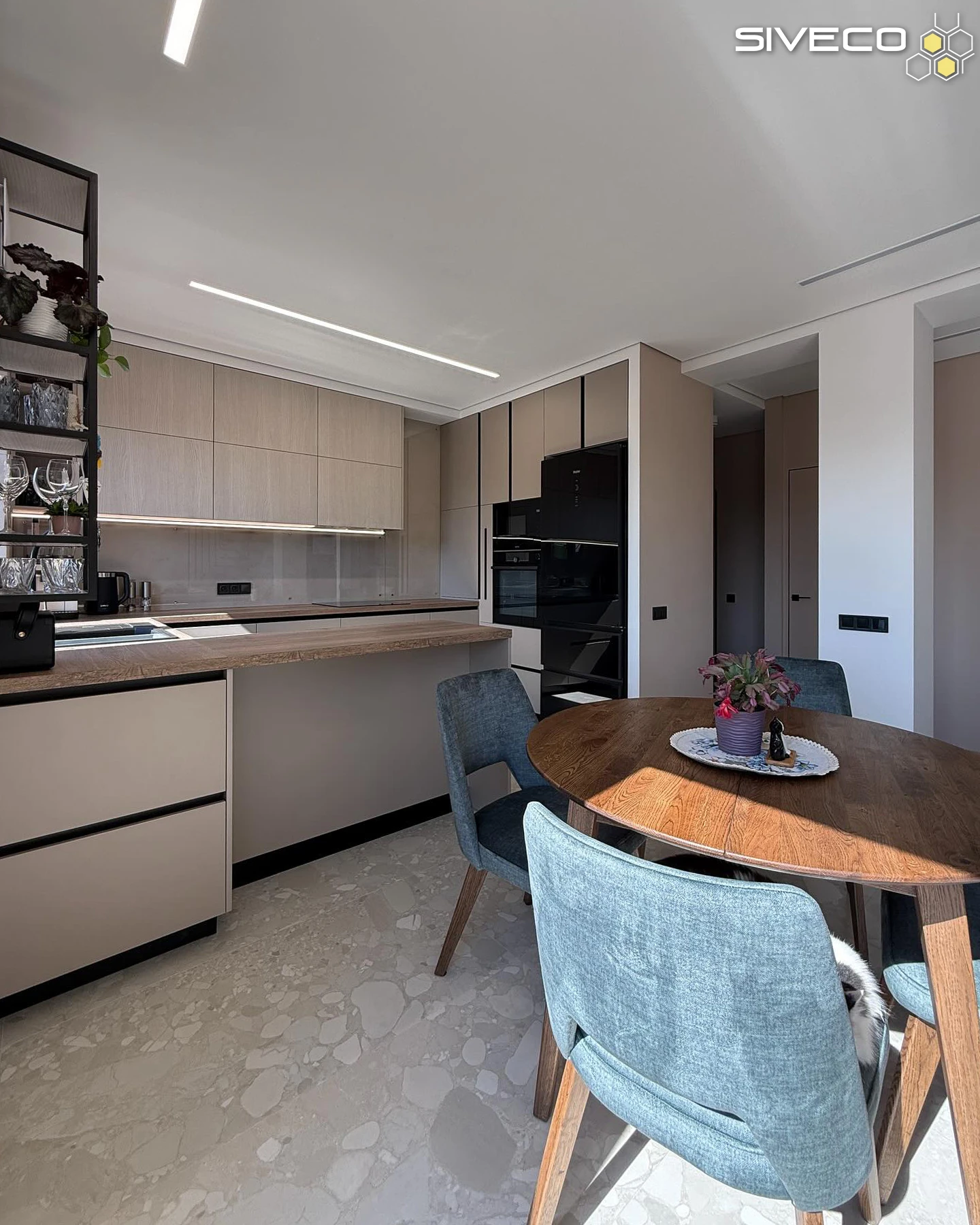 Сучасна кухня з півостровом: поєднання матового бежу та дерева