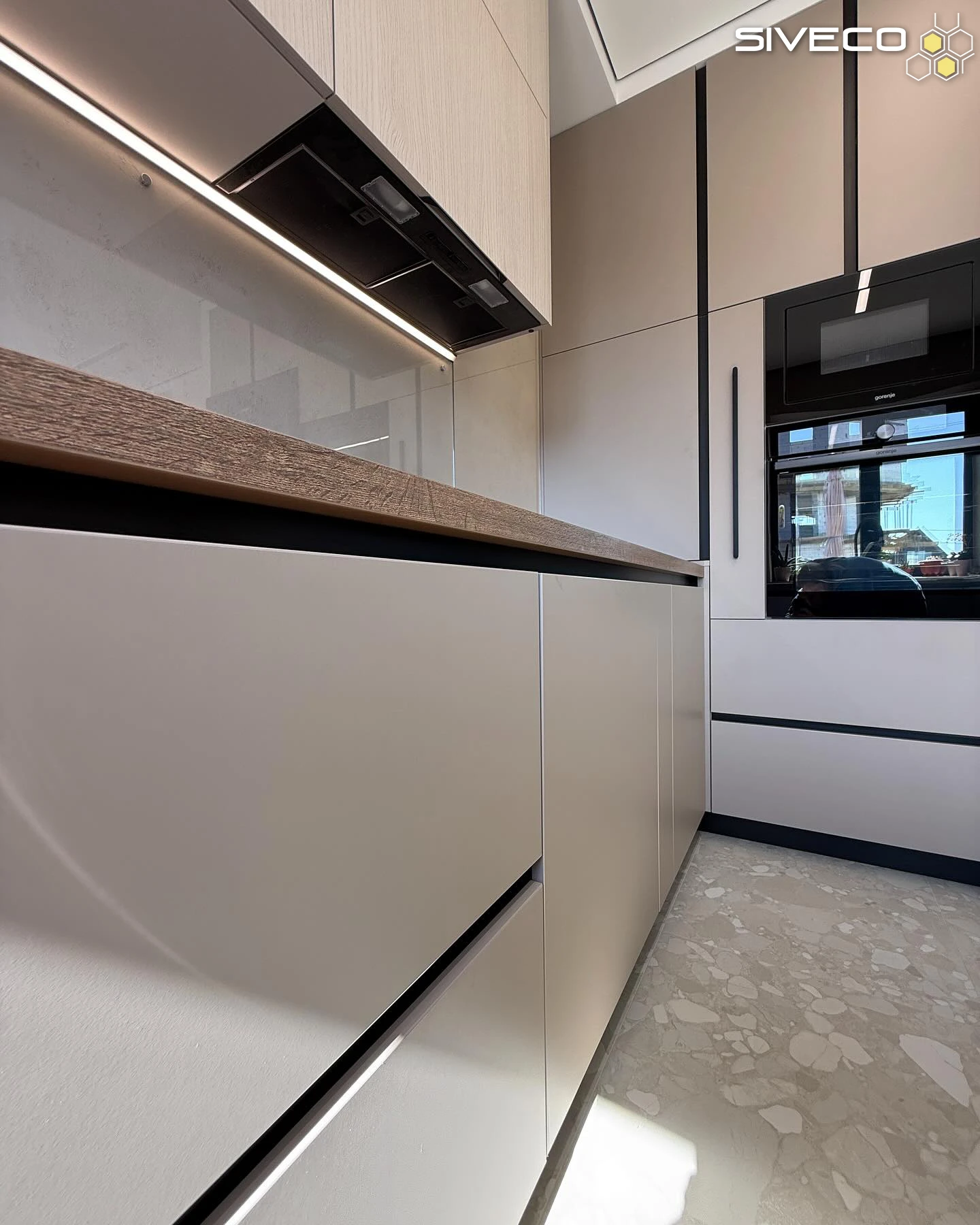 Цей проєкт демонструє, як зробити інтер'єр «живим» і тактильним. Ми відійшли від холодного глянцю, обравши матові фасади приємного кавового відтінку та поєднали їх з текстурою натурального дерева на верхніх модулях. Такий тандем створює атмосферу затишку, а підлога з малюнком «тераццо» додає простору трендової динаміки.